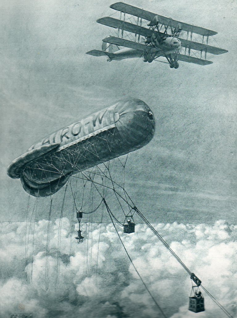 The second image appears in The Illustrated London News for 1 March 1919 and is entitled "Launching an Aeroplane from an Airship, an Experiment", and shows a helium-filled airship ("of the near future") about to drop an aircraft. The airship would have risen to some height with the aircraft already at tether, travelled a distance far beyond the normal range of the airplane-in-tow, and then release it--after a fall of a thousnad feet or so, the engines would start, and the plane would be operational. that was one way of advancing air cover far beyond what woul dhave normally been feasible.