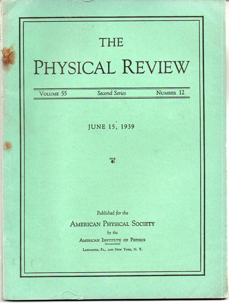 Bethe, Hans. "Meson Theory of Nuclear Forces." Lancaster, PA: American Physical Society, 1939. 1st edition. Physical Review, Vol 55, 2nd series, number 12; June 15, 1939. 1261-1264 Original wrappers. Very good condition. We offer the scarce green weekly issue of teh Physical review in its entirety. Decent copy in original wrappers, with a little scuffing and chipping to the spine. Good+ $175.00