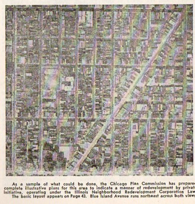 For reasons I cannot determine, this small pamphlet1 seems to be nowhere--no mention on the web, nothing in city planning databases, nothing in WorldCat (an actually nothing at all in this massive database about Mr. Biossat). It was a massive undertaking, part of a project of the Chicago Plan Commission, and sought to relieve "blighted" areas from the city by replacing them with new housing and neighborhood design. This was part of a larger construction scheme nationwide: