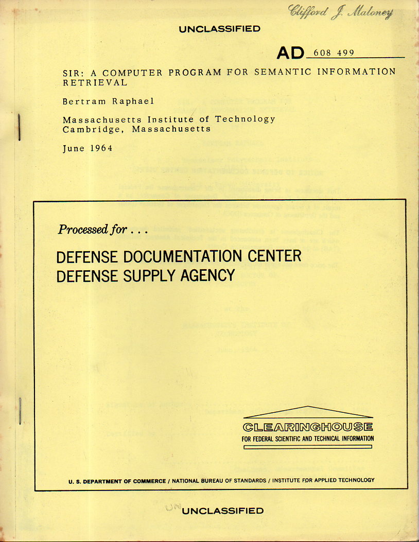 RAPHAEL, Bertram. SIR: a Computer Program for Semantic Information Retrieval. Published/printed by the Clearinghouse for Federal Scientific and Technical Information, Defense Documentation Center, Defense Supply Agency, U.S. Dept. of Commerce, June 1964. 156PP+12PP, plus one page of biographical information on Raphael with a bibliography including his work on LISP, the last entry dated May 1964. 11x8 inches, some sort of photomechanical reproduction; yellow wrappers, staple-bound. Fine condition. SOLD