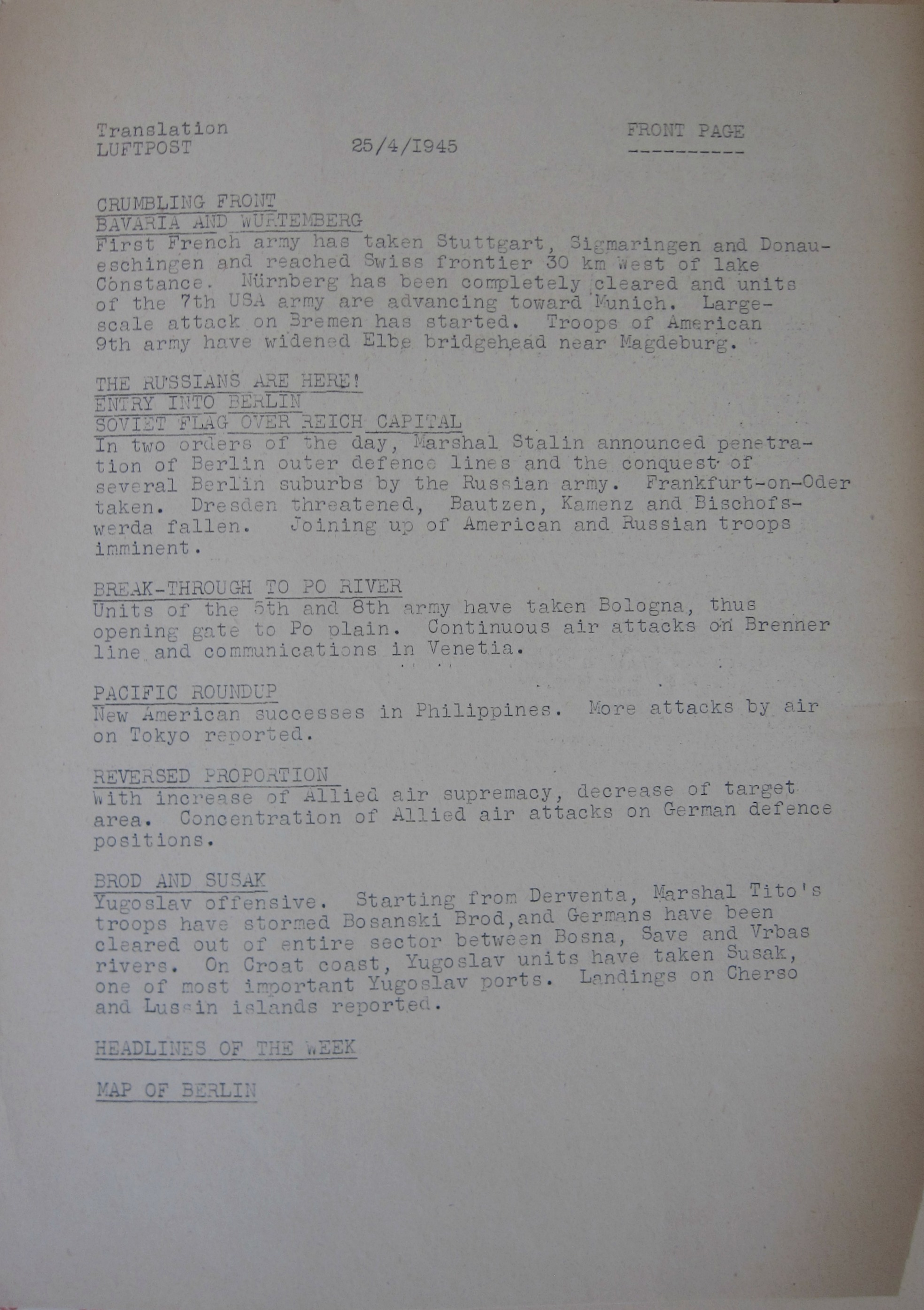 Russen Besetzen Wien. Einmarsch in Mahren. Luftpost und Soldaten-Nachrichten, 15 April 1945. With another lede story on the death of FDR. 2Pp, with a sheet of translation of the article headers. |