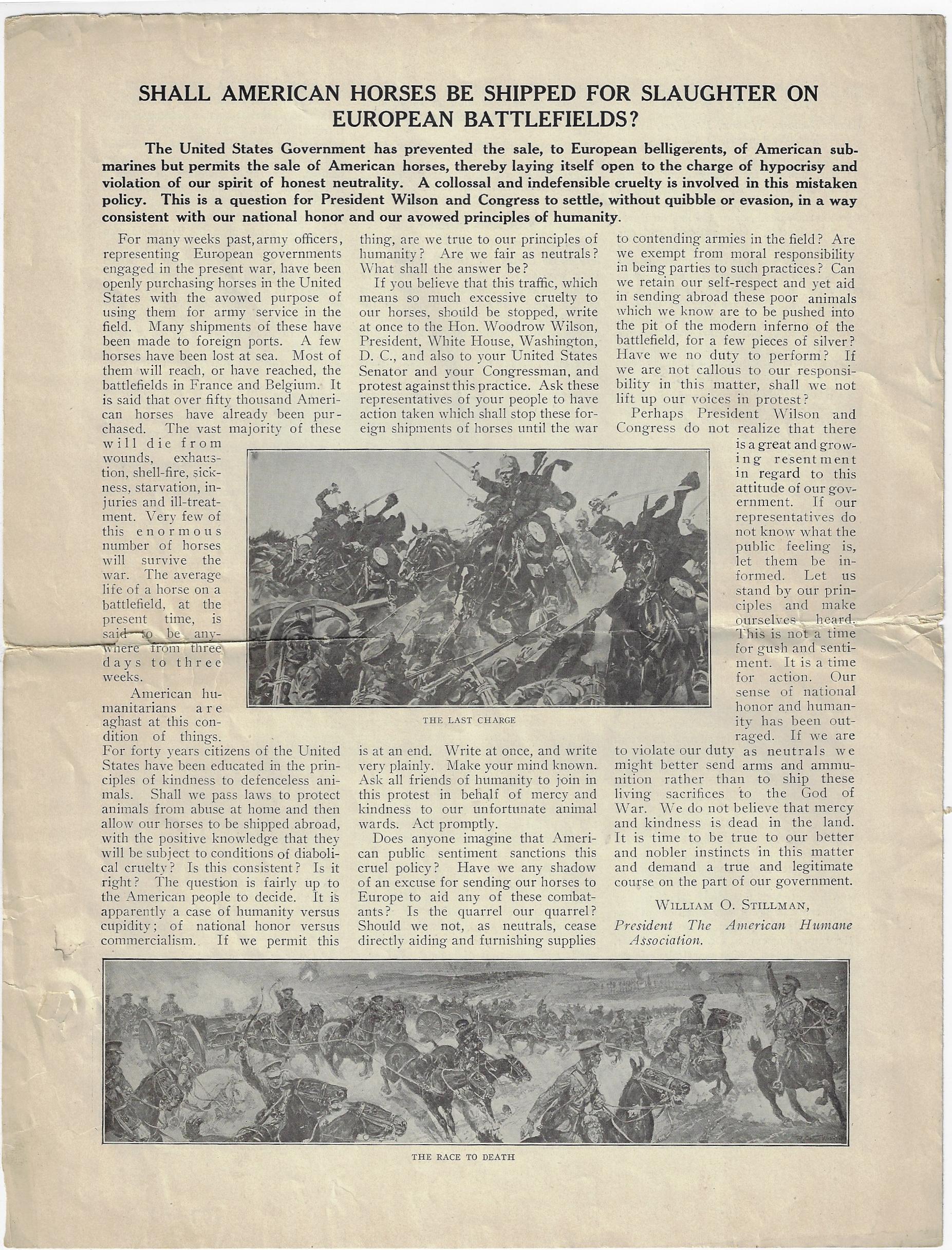 "An Appeal for Help for War Horses". 12x9", 4pp (one large sheet folded). There is a horizontal fold with two long tears in it. Overall, a FAIR copy, maybe a little better than that. $150