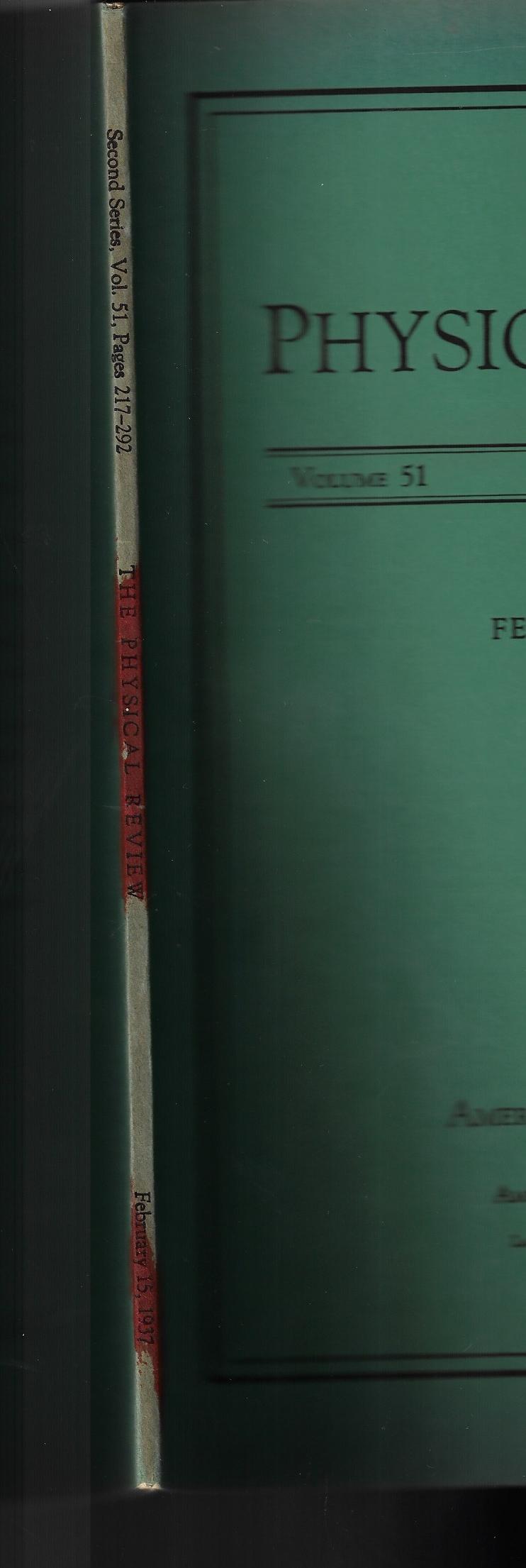 Fritz Zwicky, "Nebulae as Gravitational Lenses", in Physical Review, volume 51, number 4, February 15, 1937, with the Zwicky article being a one-column contribution on page 290 in the issue of pp 217-292. Original printed wrappers. Condition: Nice wrappers, though the spine has two red paint splotches on the spine. Fresh, but problematic copy. SOLD