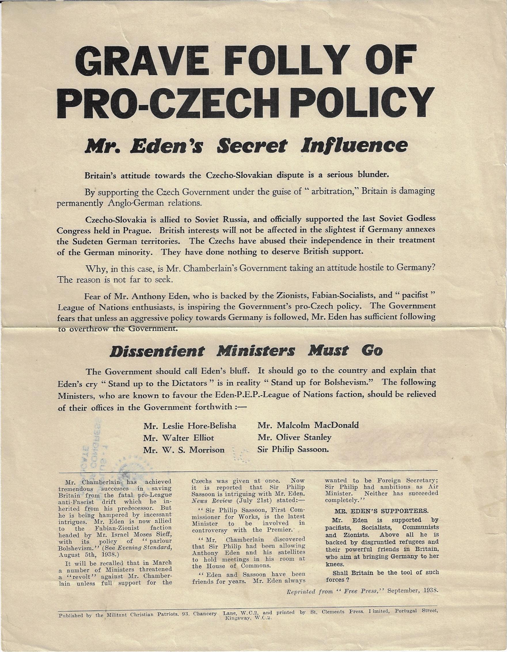 The Militant Christian Patriots (MCP) was a London-based pro-nazi fascist organization, and at the time of the printing of this broadside the Chamerblain government had not yet taken its final position on the fate of Czechoslovakia. "Britain’s attitude towards the Czecho-Slovakian dispute is a serious blunder" the MCP Felt. The MCP position was that the annexation of Czecholsovakia by Germany would not affect British interests "in the slightest", and that the Chamberlain government was adopting a "hostile attitude" towards Germany. They saw Anthony Eden’s "stand up to dictators" to be "stand up for Bolshevism", and that Eden’s supporters were "pacifists, Socialists, Communists and Zionists".