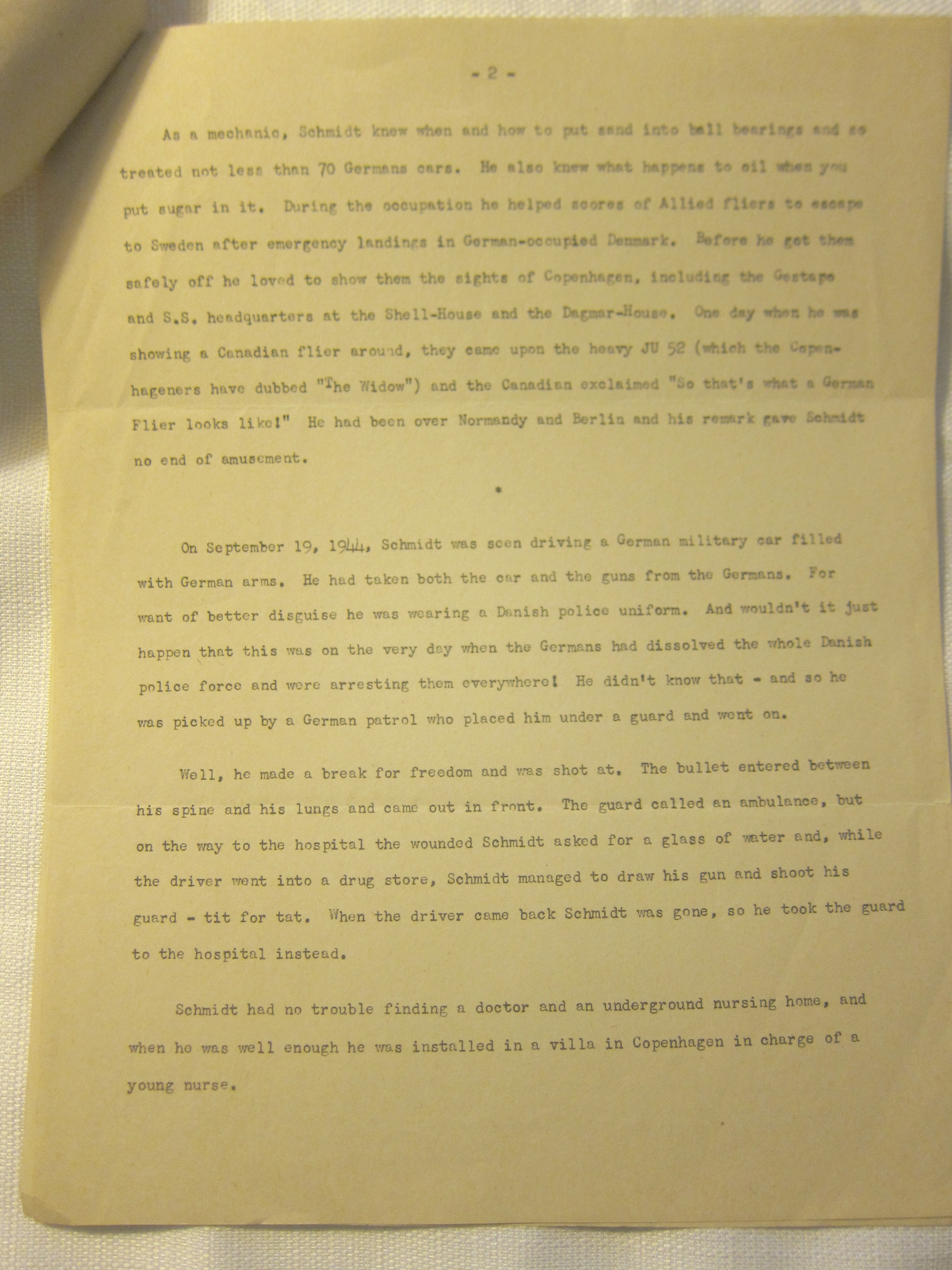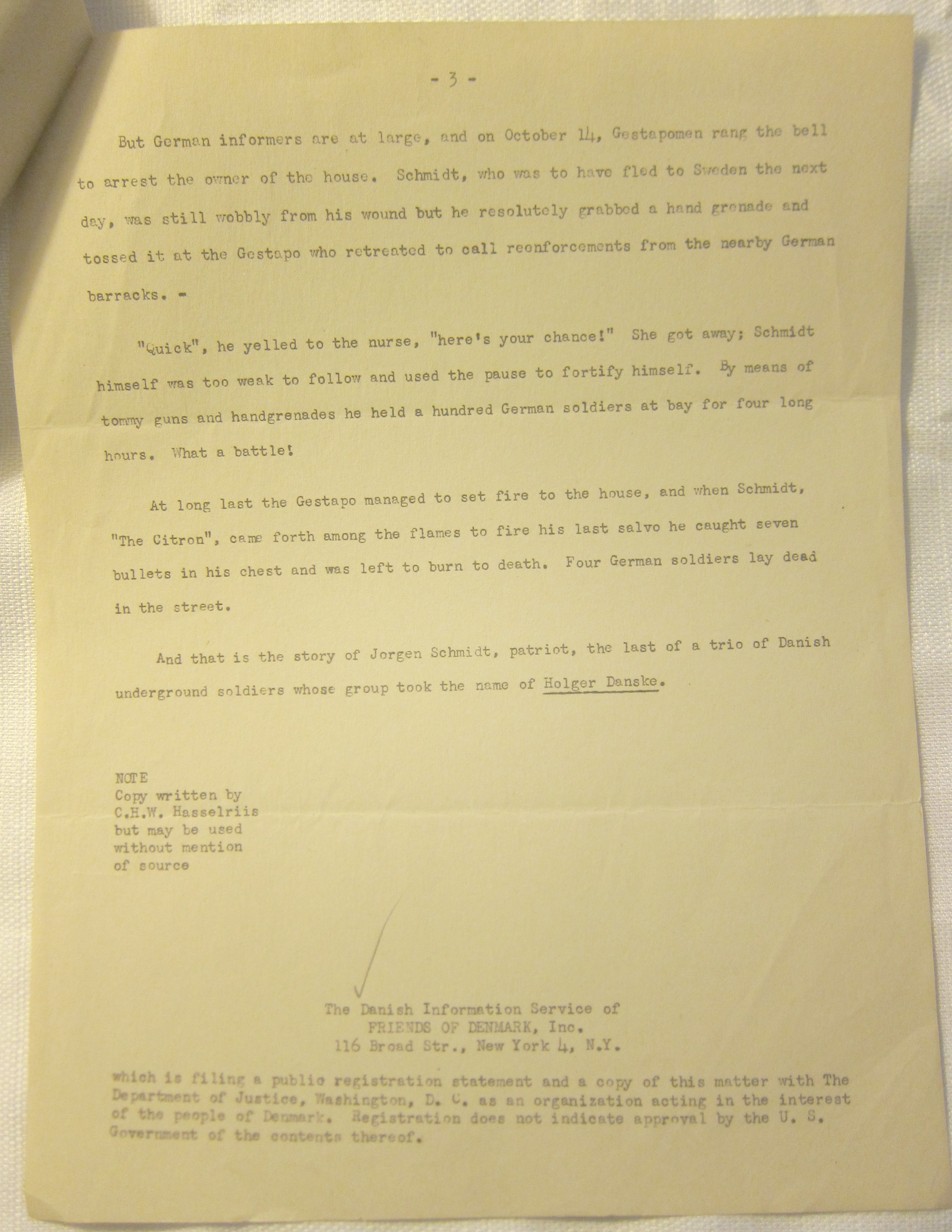 This circular “is from the December number of the underground newspaper “Danske Tidende” and tells of the heroism of a trio of Danish patriots, members all of an underground group...” including Jorgen Schmidt, Bent Fauerschou-Hvid, and Bent Ostergaard, though primarily it is the story of Mr. Schmidt, known by his nom de guerre, Citronen. Much of that story relates Schmidt's last stand against the Gestapo on October 15, 1944. I have reproduced the document, below. These three individuals represent the heroism and valor of a long-operating resistance group in Denmark against its Nazi occupiers.