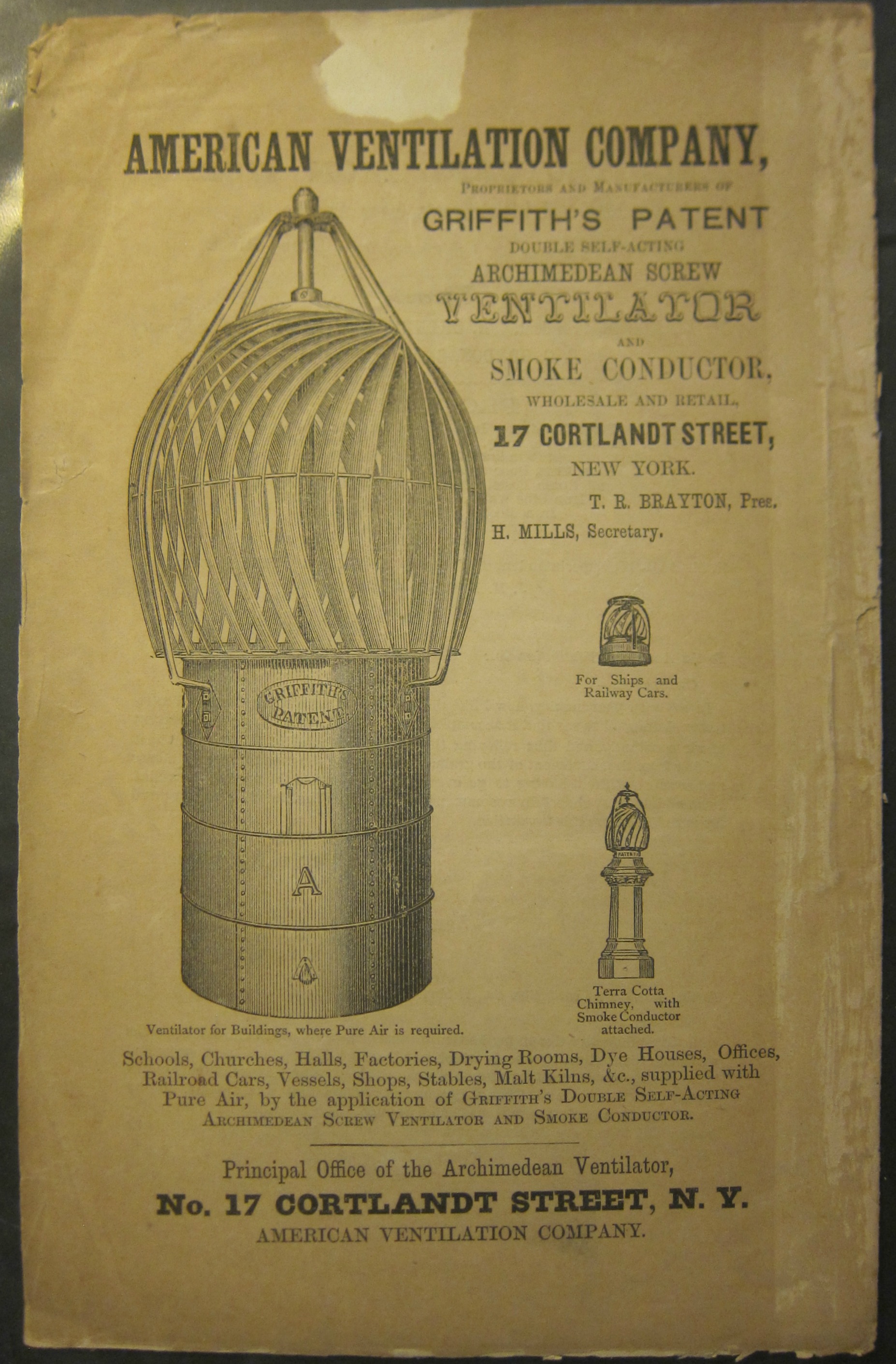 Printed in New York by the New York Printing Company, 1866. 23cm, 10pp, with 4 figures in text, plus a large illustrated ad on the rear cover. Original wrappers are fairly chipped and becoming loose. Altogether, a GOOD copy of a scarce pamphlet. WorldCat/OCLC locates only four copies (LC, Harvard, Minnesota, Rochester Medical). $100 [Griscom (1809-1874) wrote a number of books, including teh related and interestingly-titled The uses and abuses of air: showing its influence in sustaining life, and producing disease; with remarks on the ventilation of houses, and the best methods of securing a pure and wholesome atmosphere inside of dwellings, churches, courtrooms, workshops, and buildings of all kinds. New York, Redfield, 1854.]