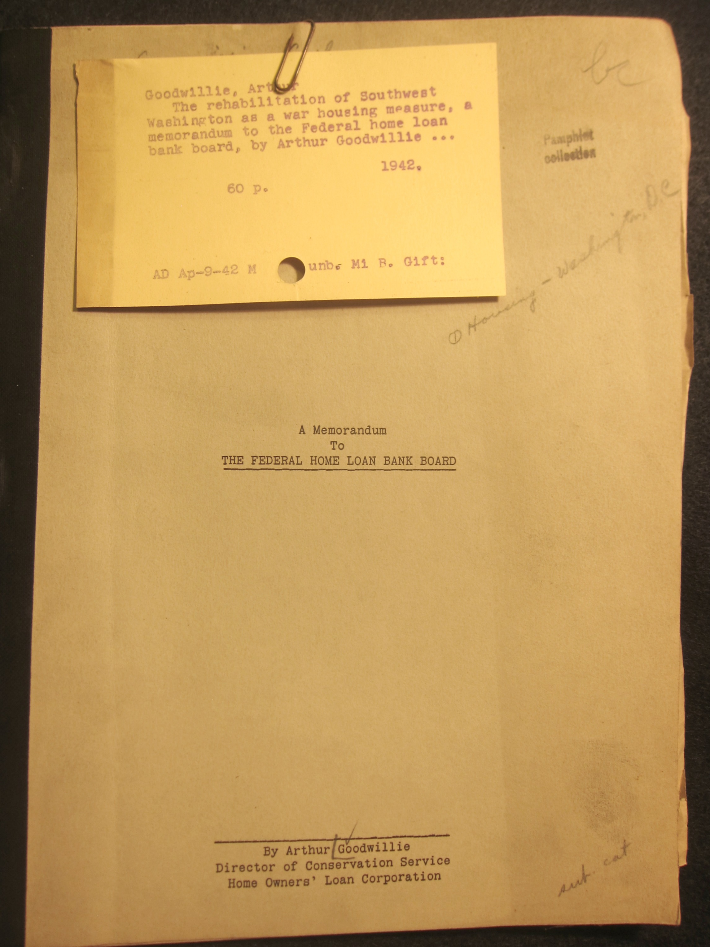 Arthur Goodwillie. The rehabilitation of Southwest Washington as a war housing measure, a memorandum to the Federal Home Loan Bank Board.