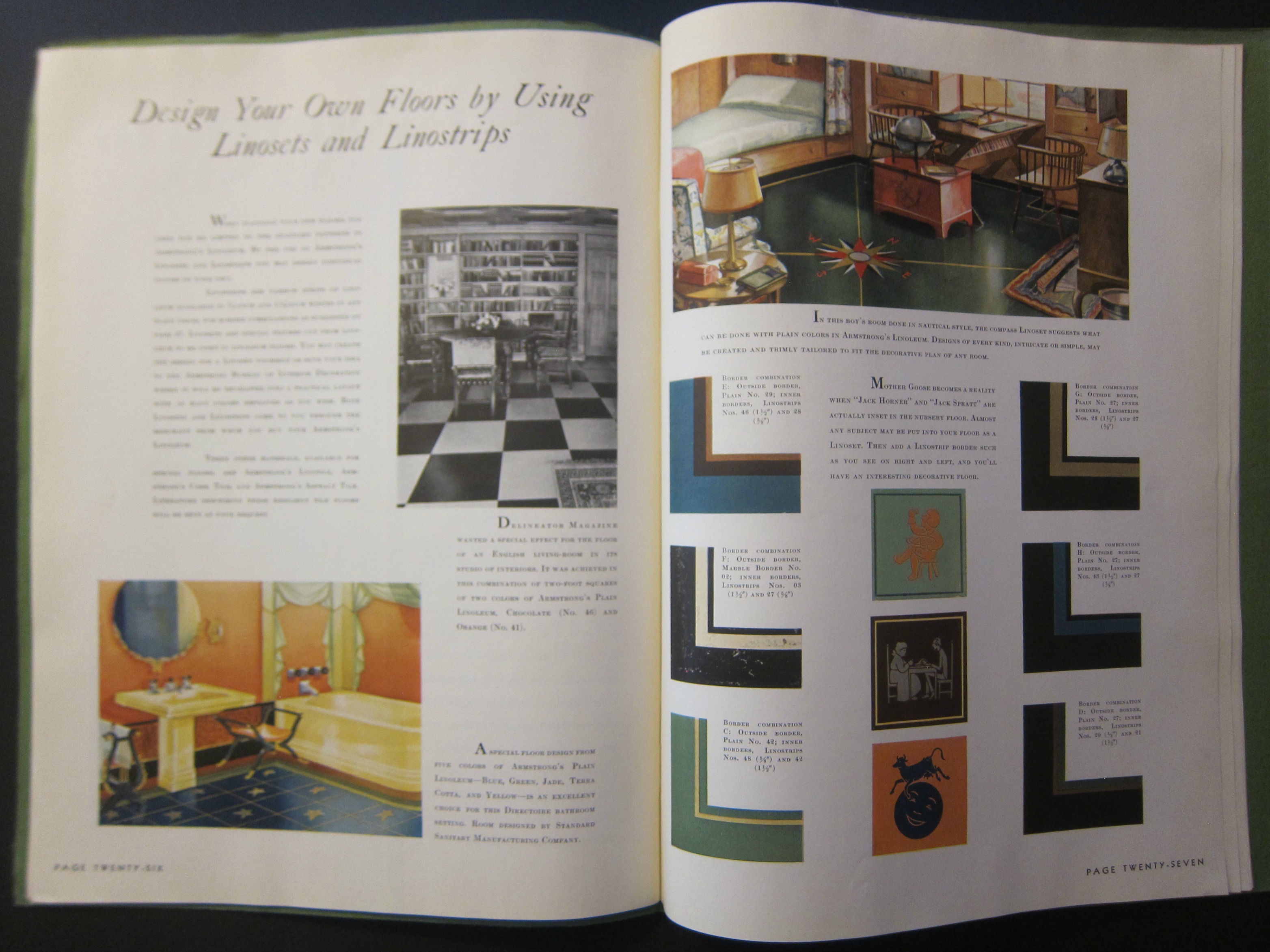 Armstrong Cork Company, Floor Division, Lancaster, PA., 1931. 11.75x9", 36pp, illustrated throughout with color and bw images, and printed on a heavier, semi-glossy paper. Bound in nicely decorated Art Deco wrappers. Provenance: Library of Congress, though the only evidence of that is the LC surplus/duplicate stamp on the rear of the front cover. Very Good copy. $100