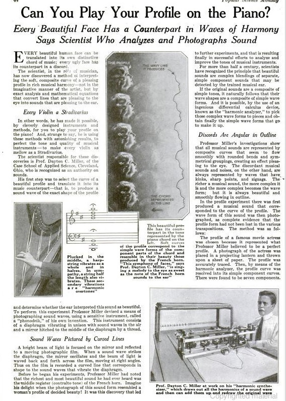 "The version used by Dayton Miller was designed and built in the laboratory and instrument shop of the Physics Dept. of the Case School of Applied Sciences. It consisted of 32 rotating pin-and-slot devices (see diagram below), each of which produced simple harmonic motion with a specified amplitude and phase; these 32 elements controlled the motion of a single cable that traced out the combined wave with a stylus and sliding drafting table. It was used by Dayton Miller to check the results produced by the harmonic analyzer against the original phonodeik curve..." http://www.phys.cwru.edu/ccpi/Harmonic_synthesizer.html
