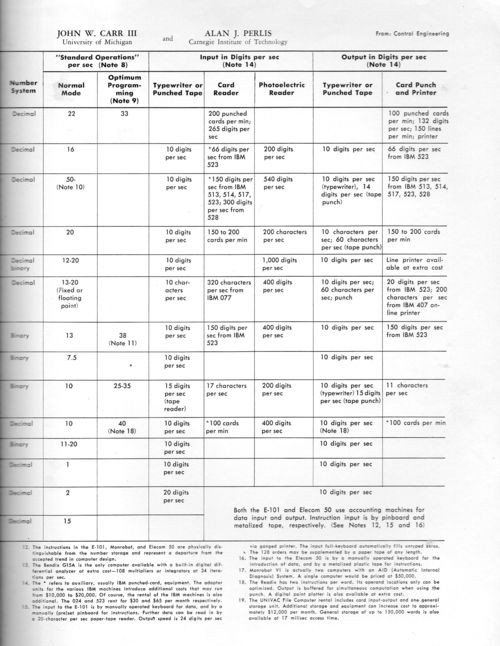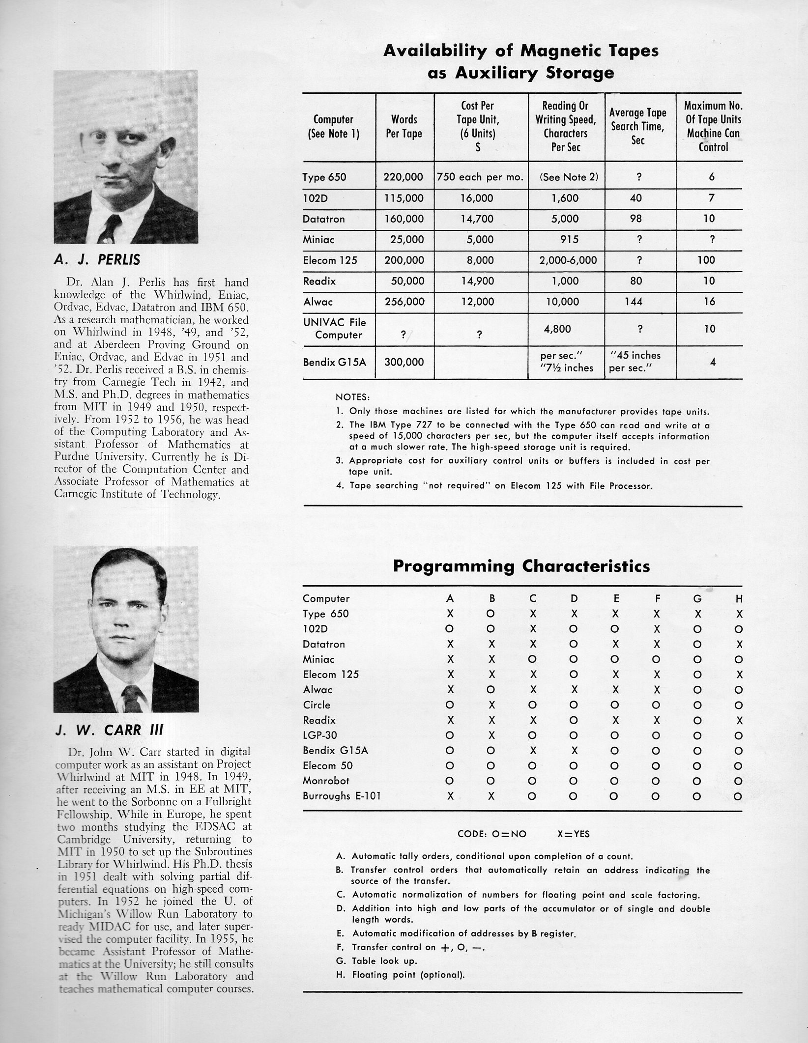 This pamphlet looked innocent enough, 12" tall and one folded piece of paper, and published in 1956, but there was a lot more to the simple publication than you'd expect from something so modest. The authors--John W. Carr III and Alan J. Perlis--were heavy hitters, and so I really wasn't very surprised to see what they had done "inside", though I was impressed and happy to see the data. Displayed on the 11"x16" sheet of paper are 15 data points on 14 computers, many of them classic/famous: the 650 IBM, UNIVAC, Elecom, Alawac. (Remember that when you're looking at purchase price and monthly rental amounts that the 1956 dollar is equal to about $8.70 in 2015 dollars, so that $3275/month for the 650 would be about $30k. The $136k for the Datatron is about a million today.)