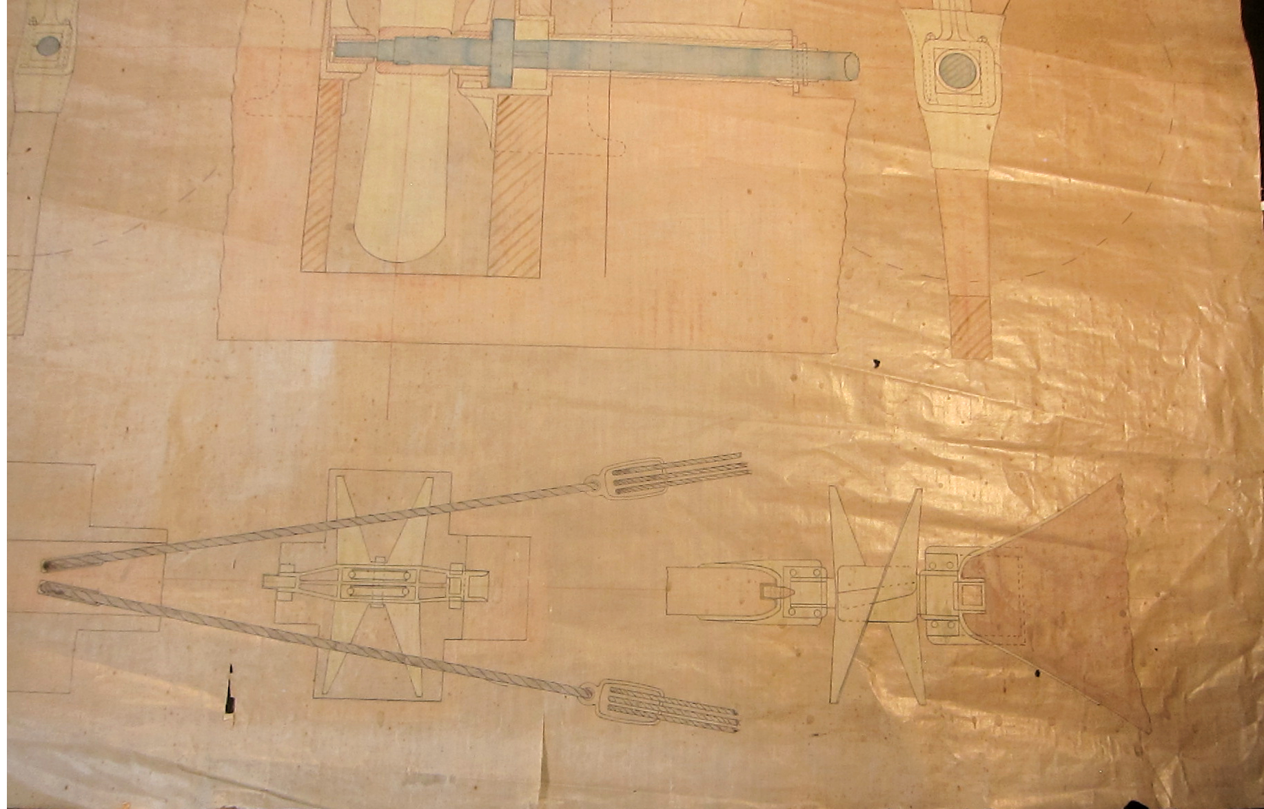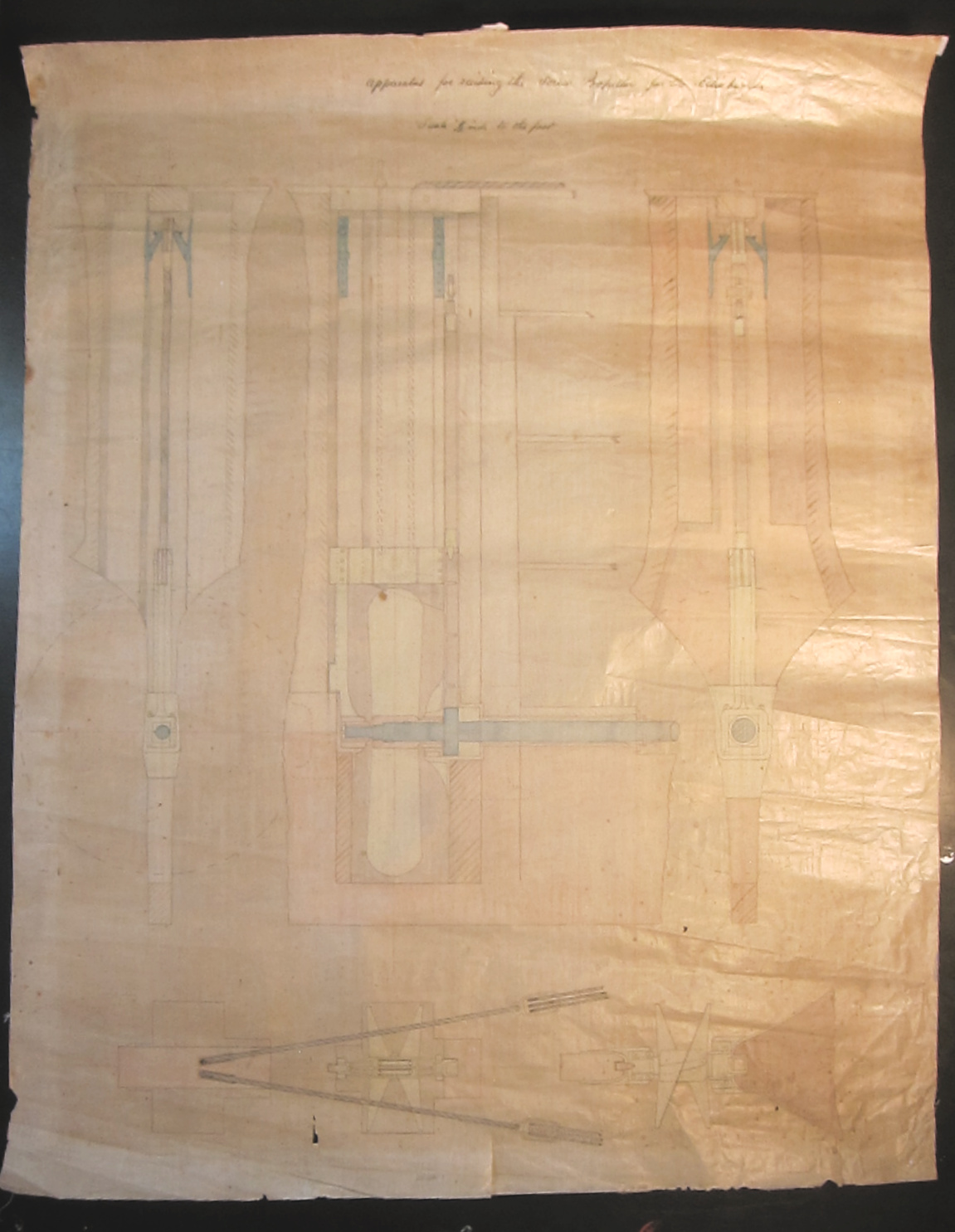 Original drawing on oilskin of a device used to raise the propeller of the HMS Esk, an early-use example of a modern screw propeller, 1854.