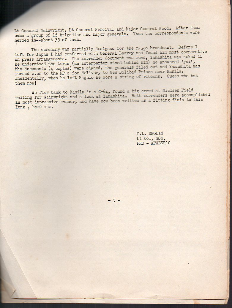 Deglin, Lt. Col T(heodore) .L. (“PRO AFWESPAC”, Public Relations Officer, Armed Fores Western Pacific, Phillippines). Account of a Trip to Japan and to Baguio to Witness Surrender of Imperial Japanese Forces and of Japanese Forces in the Philippines. 1945 5pp. Very good condition. $950