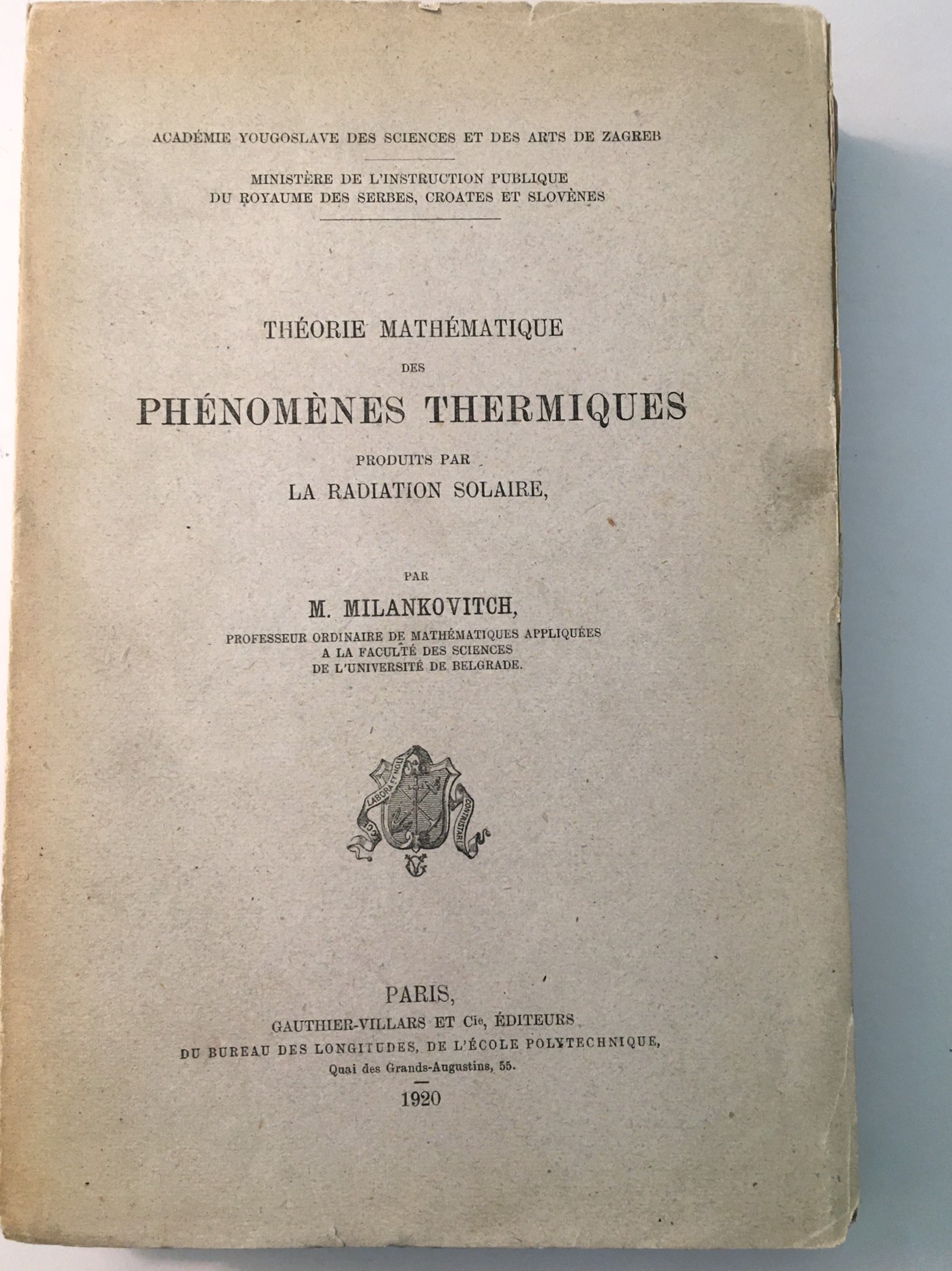 "He formulated a precise, numerical climatological model with the capacity for reconstruction of the past and prediction of the future, and established the astronomical theory of climate as a generalized mathematical theory of insolation. When these most important problems of the theory were solved, and a firm foundation for further work built, Milanković finished a book which was published in 1920, by the Gauthier-Villars in Paris under the title "Théorie mathématique des phénomènes thermiques produits par la radiation solaire" (Mathematical Theory of Heat Phenomena Produced by Solar Radiation). Immediately after the publication of this book in 1920, meteorologists recognized it as a significant contribution to the study of contemporary climate."--Milankovitch wikipedia entry