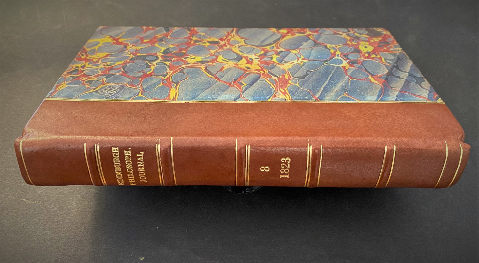 BABBAGE, Charles. "On the Theoretical Principles of the Machinery for Calculating Tables. In a letter from Charles Babbage. Esq. F.R.S. Lond. & Edin. To Dr. Brewster". In the Edinburgh Philosophical Journal, October 1, 1822 to April 1, 1823, volume VIII. Edinburgh, printed for Archibald Constable and Co. 1823. The Babbage occupies pp 122-128 in the volume of iv,iv,428pp, with 7 plates (one folding). Newly rebound in half-calf and marbled boards, with gilt decorated raised bands, new (heavy) endpapers—a lovely job by the binder. The text is clean and fresh, and the binding is new. FINE copy. $750