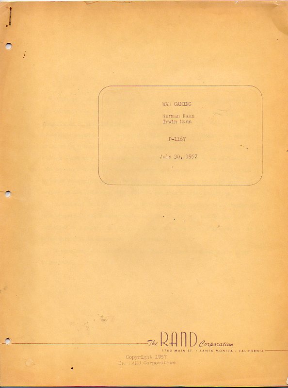 ITEM: Kahn, Herman. "War Gaming", a RAND Publication, P-1167, 30 July 1957. 11x8 inches, 14 leaves, mimeographed advance sheets. This is section#10 of Kahn's Military Planning in an Uncertain World, which was published at least in five separate parts before being published as a unified whole. RARE. $250.00