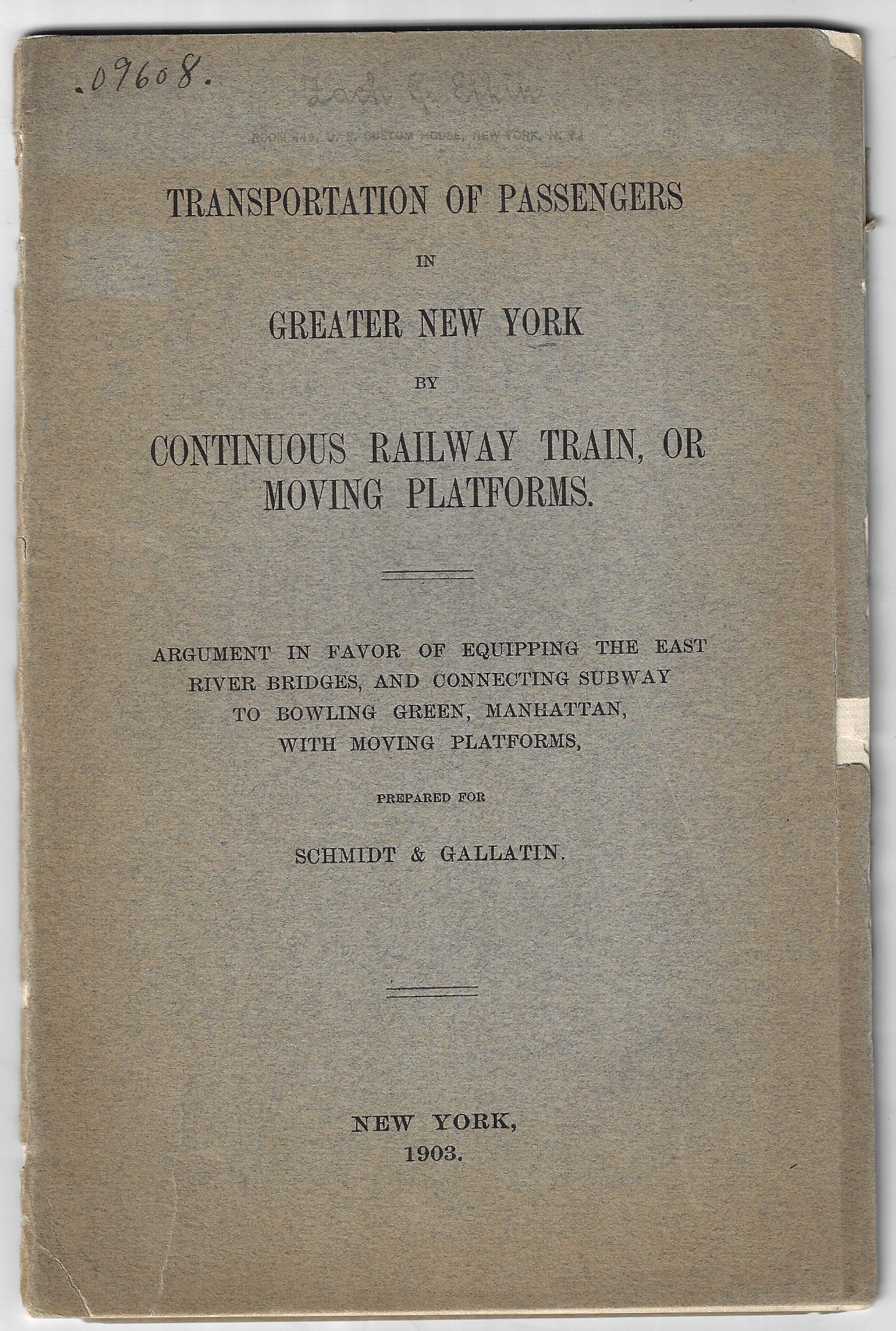 Transportation of passengers in Greater New York by continuous railway train, or moving platforms. Argument in favor of equipping the East River bridges, and connecting subway to Bowling-Green, Manhattan, with moving platforms, prepared for Schmidt & Gallatin. New York, 1903. (No indication of publisher.)