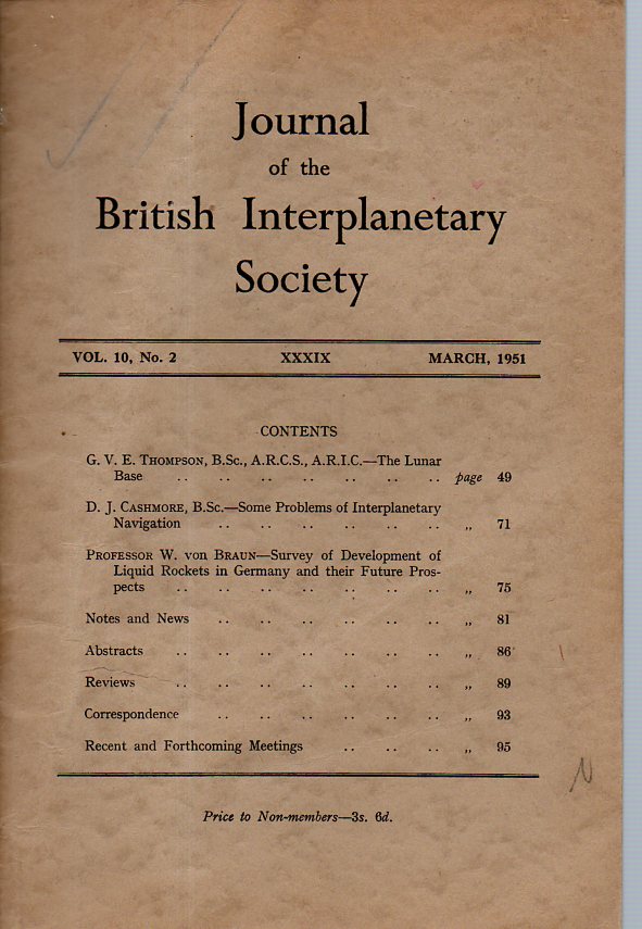 Journal of the British Interplanetary Society, March, 1951. Individual issue in the original wrappers. Nice copy. Includes the von Braun article (described following) and GVE Thompson "The Lunar Base". Issue contains 46-pages. Very good copy. $85