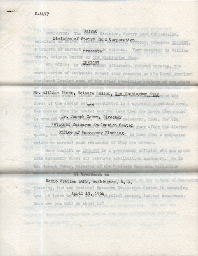 UNIVAC, Division of Sperry Rand Corporation, presents INSIGHT. Carbon copy transcript of a broadcast on Radio Station WGMS, Washington D.C., April 13, 1964. 8 leaves on onionskin paper. Fine copy. Two horizontal folds. SOLD