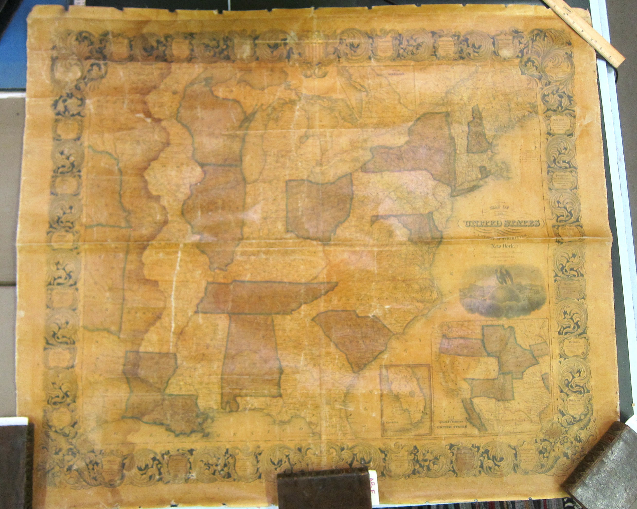 CONDITION: there are three scratches on the front cover (the largest 3mmx20mm) as well as three spots of heavier wear that has removed some of the design in the marbling on the front board; also, there is some scattered foxing. That said, this is still a solid, VERY GOOD copy, tight and crisp. MAP: 19x28cm, with four old vertical folds, and is printed and trimmed nearly to the borders. There is some occasional and very light foxing, but in general the map is very bright, crisp, and fresh, and no doubt had received very very little attention. The map's condition is FINE to VERY FINE. $950