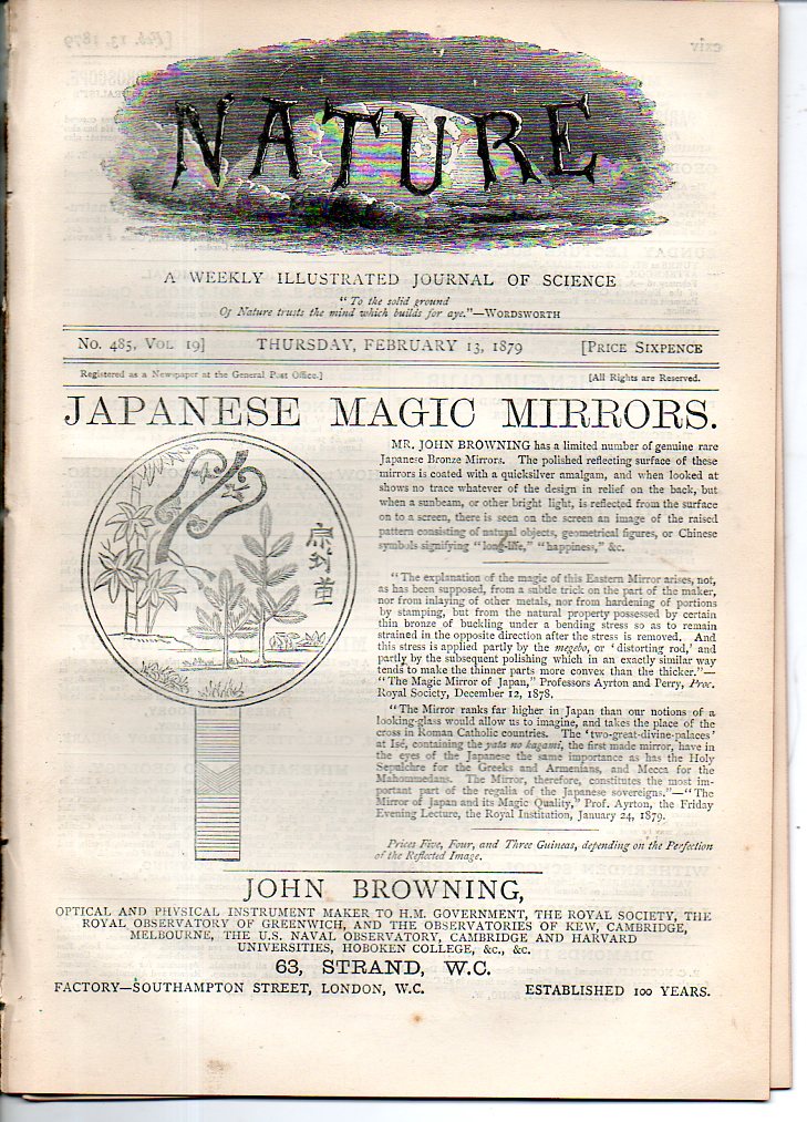 Heaviside, Oliver. "Quaternionic Innovations", in Nature, page 245, 11 January 1894, volume 49, pp 241-264. With the original printed outer wrappers, front and back, with the elusive ads section. Nice copy, though with old vertical fold. Old faded library stamp on front cover, "Smithsonian Institution/Astrophysical Laboratory". $95