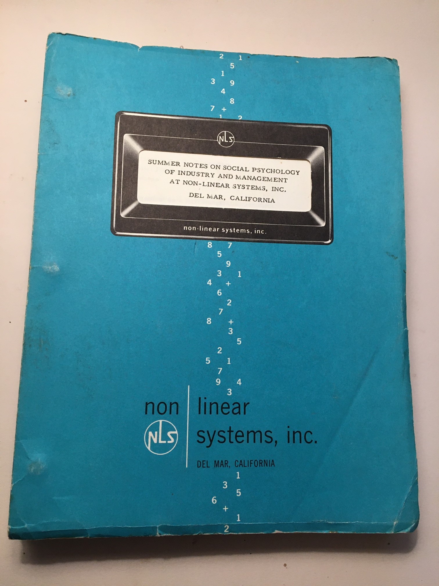 "I had never before had any contact with industrial or managerial psychology, so the possibilities for psychological theory hit me with great force as I read first the books by Drucker and McGregor that are used as "textbooks" at Non-Linear, and as I began to understand what Andrew Kay was trying to do there.I started dictating my impressions to the tape recorder. They are mimeographed here without editing, addition, subtraction, or other change, beyond correction of typographical and grammatical errors, to be passed out to my friends for discussion, because I don't know if they will ever be published more formally."