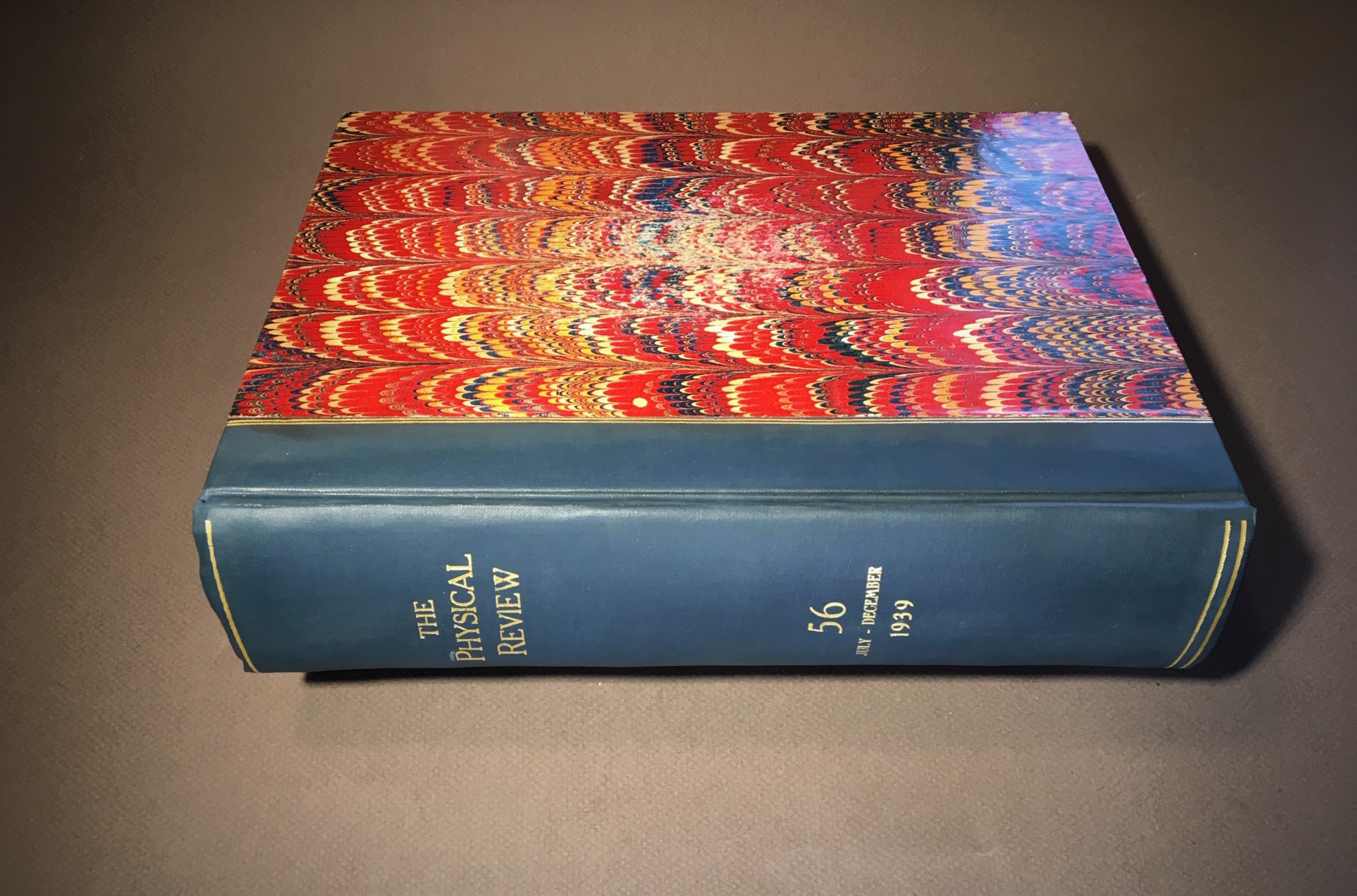 American Physical Society, Lancaster Pa., January-December 1939. Two volumes: x, 1294pp & x,1300pp. The two volumes, complete. Finely and sturdily rebound in cloth and marbled boards. Very stout, readable volumes. Fine condition. Few scant ownership stamps on some of the individual issues' first page. $2250