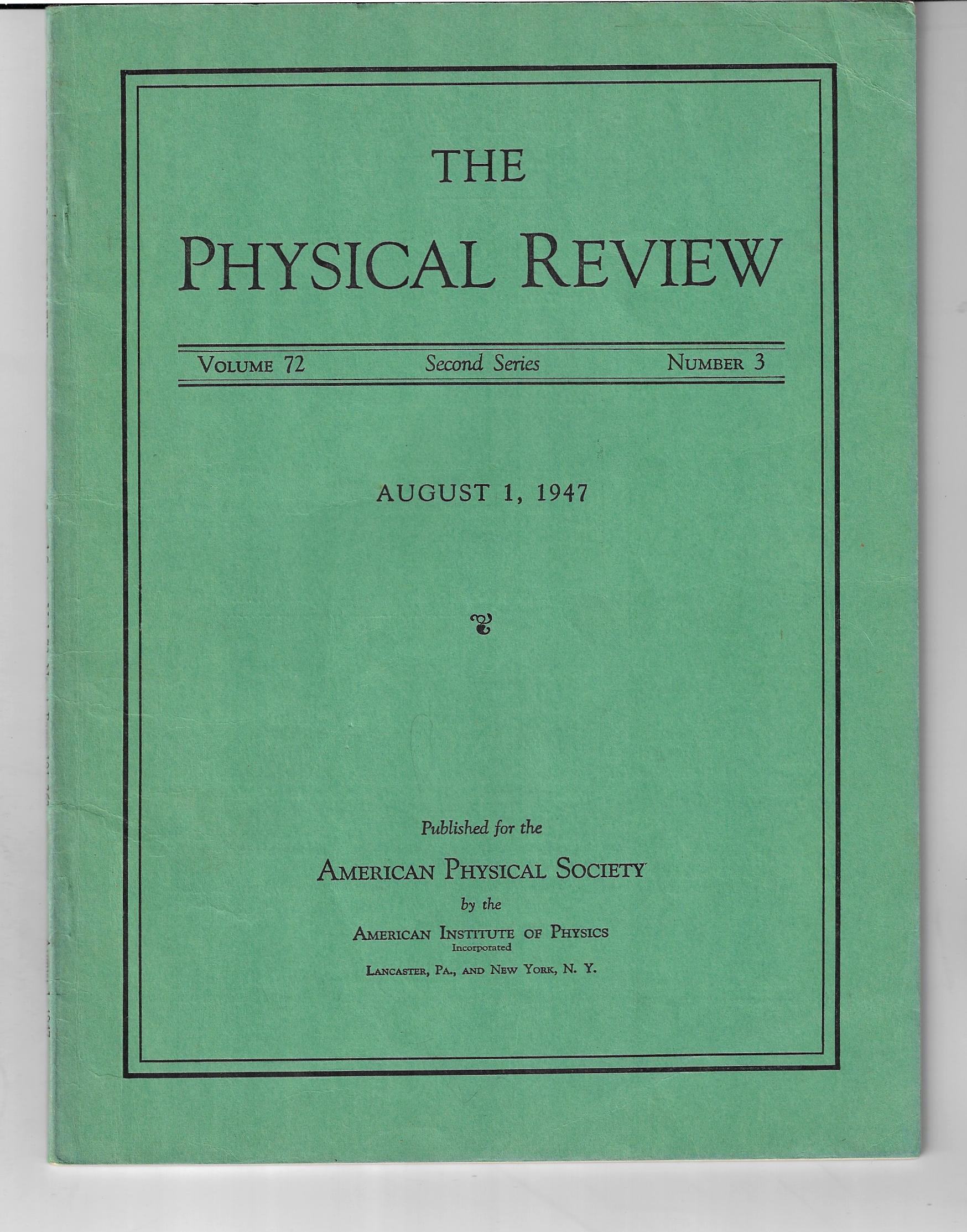 "Theory of Quantized Fields. II and III" In Physical Review, volume 91 number 3, August 1, 1953, pp 713-728 and 728-740 in the issue of pp 505-772. Original wrappers. This issue has some problems with the spine cover and the inch or so onto the front wrapper a sort of damp staining or some such. Copy of Al Wattenberg, with his signature on the upper right front wrapper.