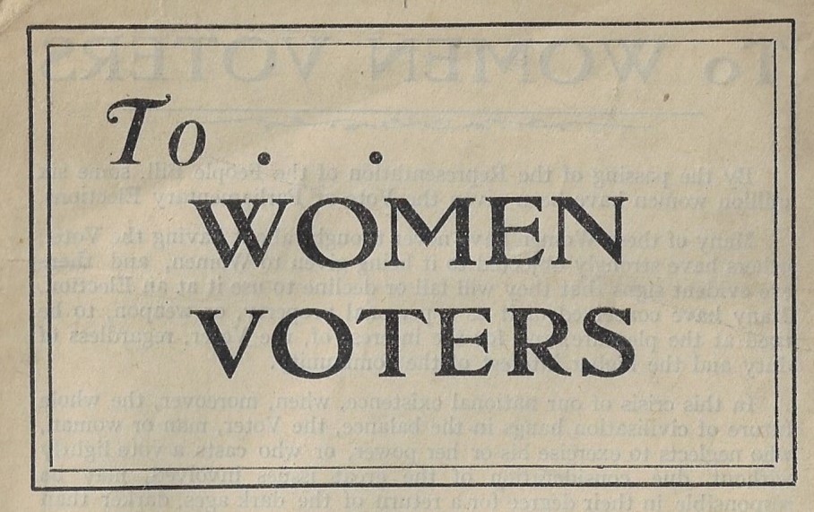 To Women Voters. Printed by Sir Joseph Causton (viz Midsomer!) of London for the Lloyd George U.K. Coalition Government, 1918. 8.5” x 5.5”, 4pp (one sheet folded in half. Provenance: from the collection of Prof. E.D. Adams to Leland Stanford Jr University, and then the Library of Congress. The LC surplus stamp is on back cover, while the small Stanford stamp is at the bottom of page 2. Good condition, with some bumps and short tears around edges. Printed on very thin paper. $125