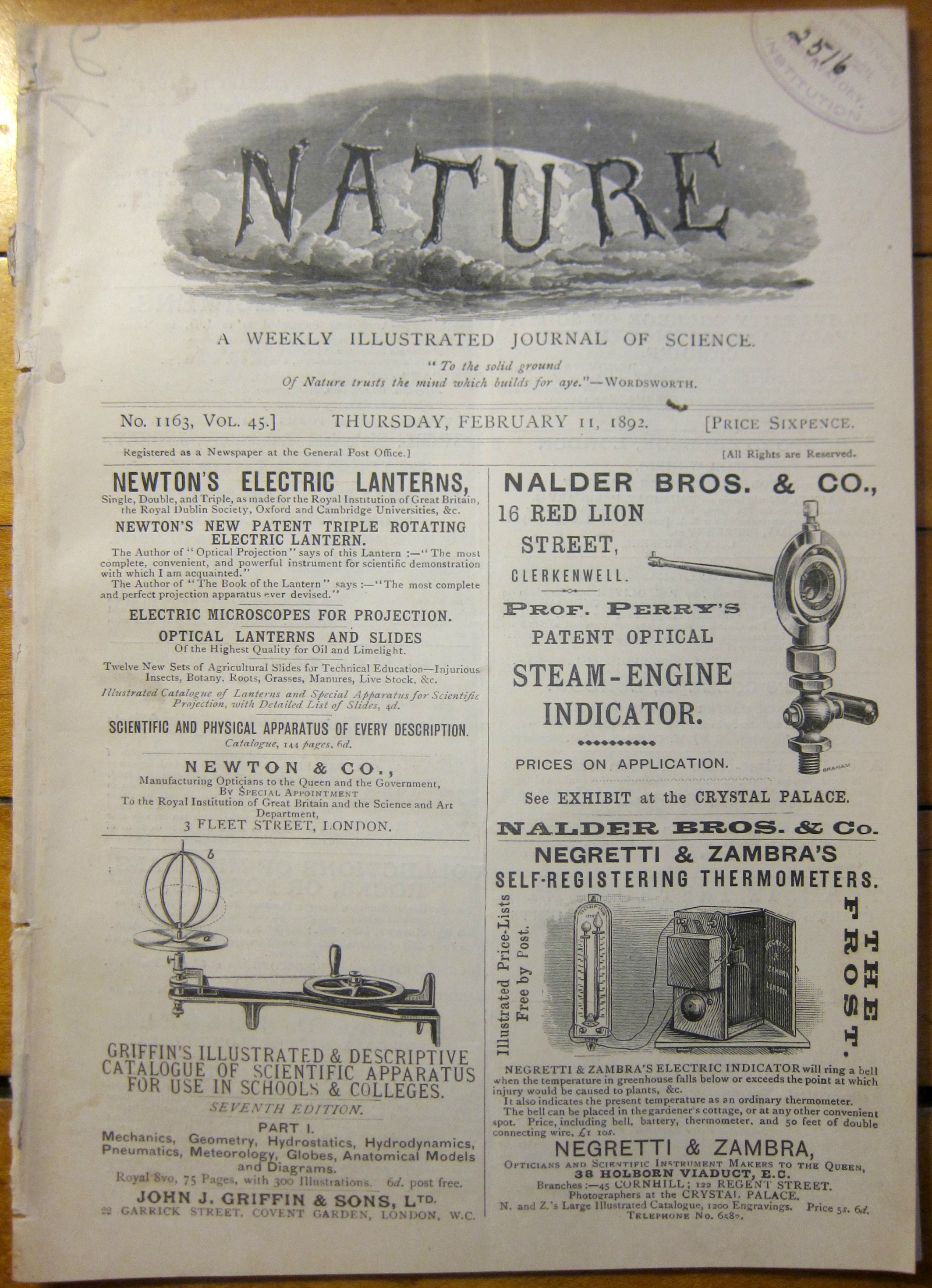 Langley, Samuel Pierpont and Alexander Graham Bell. “Experiments in Mechanical Flight”, in Nature, volume 54, May 28, 1896, page 80 in the issue of pp 73-96. Offered is the weekly issue in the original wrappers (cover plus 3pp of advertisements), removed from a larger bound volume. Provenance: this is a good association copy as it comes from the Langley's own Smithsonian Institutions' Astrophysical Observatory, via the Library of Congress. Condition: there are two vertical pressure marks that run through the volume—they are very light, but they are definitely visible. GOOD+ copy $250