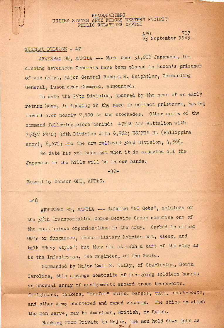 What American Papers Say. October 21, 1944., 13x8", 3pp.