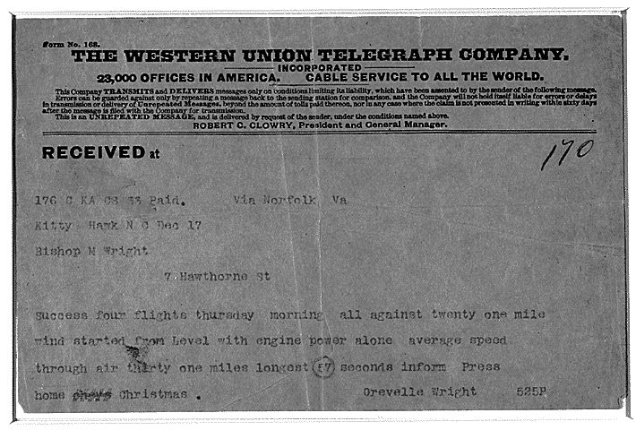 This image of the telegram that the Wright brothers sent to their father for the go-ahead is incredible for its brevity, its understatement and its misspelling. Of course sending a telegram was relatively expensive and the Wrights didn’t have very much money, so, perhaps the brevity can be sort of explained. Sort of; after all, they did just become the first people to fly a heavier-than-air aircraft, and perhaps a little excitement would be present. But no, the Wright family had a plan and a plan well worked out, so the quick note would suffice, no matter how momentous the achievement. I should also point out that the outcome was unexpected.