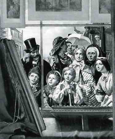The next and last image is a little odd, showing a view from the inside of a print shop looking out at people who are looking in. The print, One Touch of Nature Makes the Whole World Kin (1867) by Thomas P. Hall, is otherwise semi-satisfying in a mid-Victorian kinda way, what with the luminous and wondrous eyes filled with the beauty of the painting at left. Hall's work does live up to its name, though, the artist interestingly including a silk-hatted fob connoisseur with a monocle, some few children, a child laborer (a street sweeper, I guess, not unlike The Last Picture Show), three generations of women, a drayman with a pipe, and an omnibus driver--a good assortment and spectrum of people in such a small group.