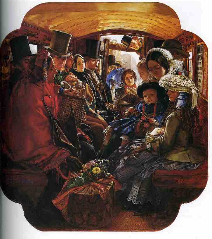Next is William Maw Egley (1826-1916), whose Omnibus Life in London2, also published in 1859, gives a wonderful view from beyond the back of the cab/bus, giving a very colorful overview of flouncy and mega-dressed inner-city mass transit. The red shawl business woman in the front-left definitely seems a little at odds with the rest of her traveling companions, though most are taking an interest in her beautiful basket of flowers.
