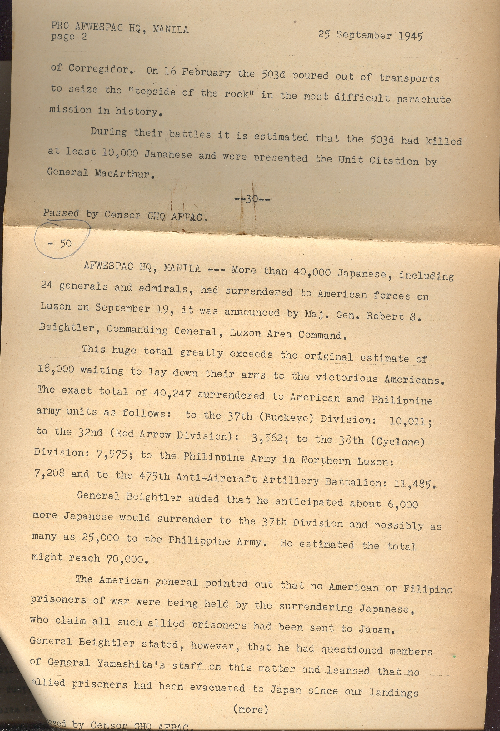 This short document relates the story of the capture of the last of the Japanese forces in Luzon, including the capture of some 40,000 troops, including General Yamashita ("The Tiger of Malaya") and soon-to-be-executed war criminal and beast of Manila.