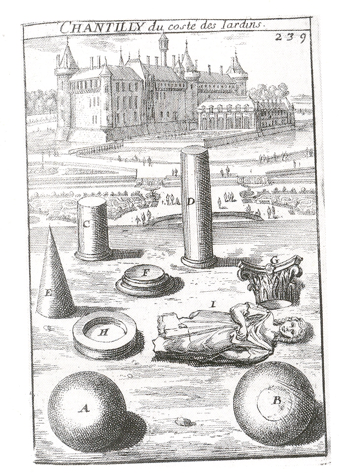 I am very fond of images like this--images that show us everything and nothing. The engraving was meant to show some of the ephemeral antique bric-a-brac collected by whatever collector was currently residing at Chantilly. Remove that explanation, and the meaning of the engraving goes spinning into whatever space you open for it. It is a wonderful thing to open these dis-associated image combinatorics to free interpretation, each viewer finding their own meaning in a mysteriously composed components.