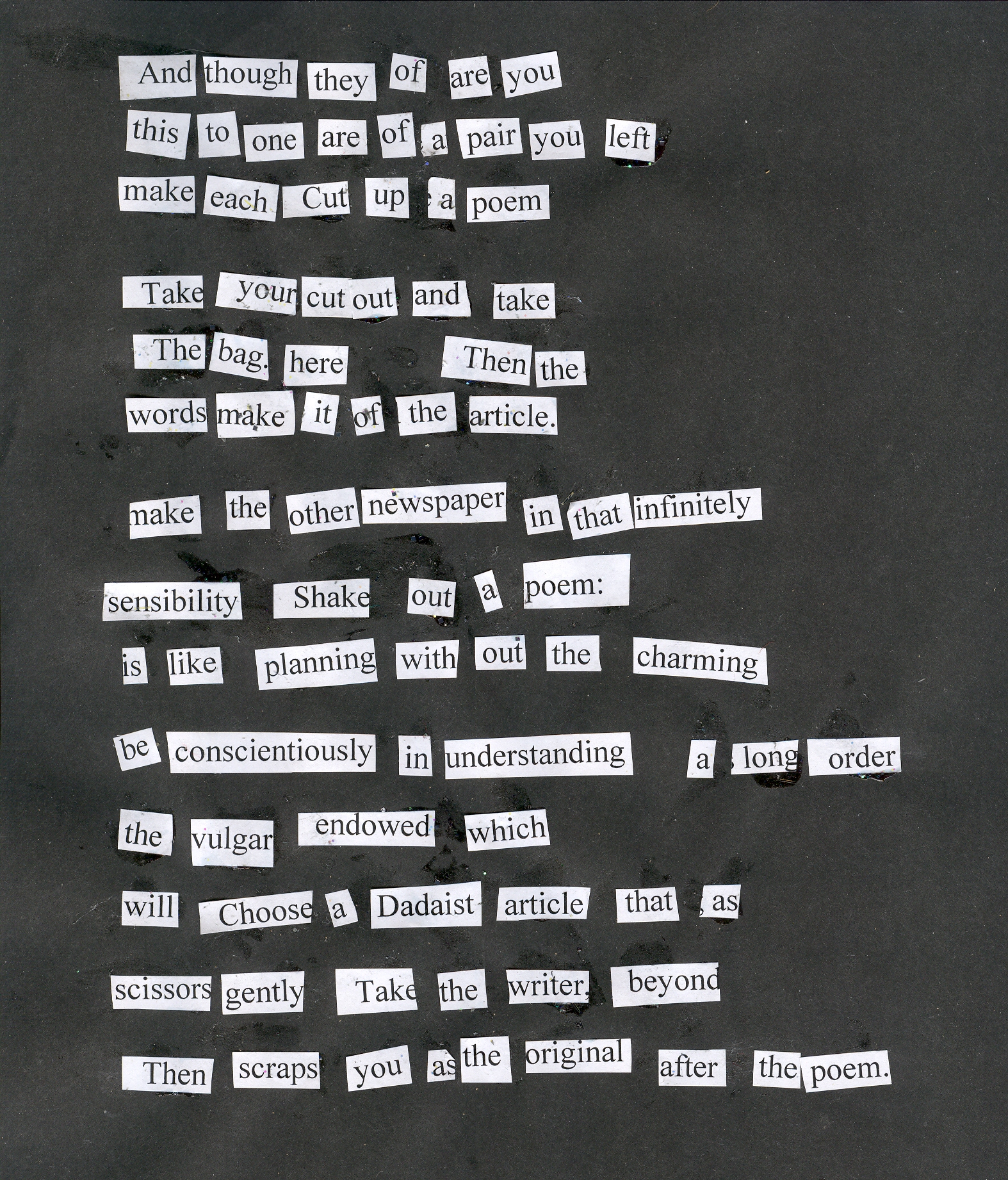 I tried this out, but not with newspaper--rather I did it with Tzara's instruction itself, and let me tell you, it doesn't work. There's just too much left to chance, and, frankly, too many prepositions, too much grunting work.