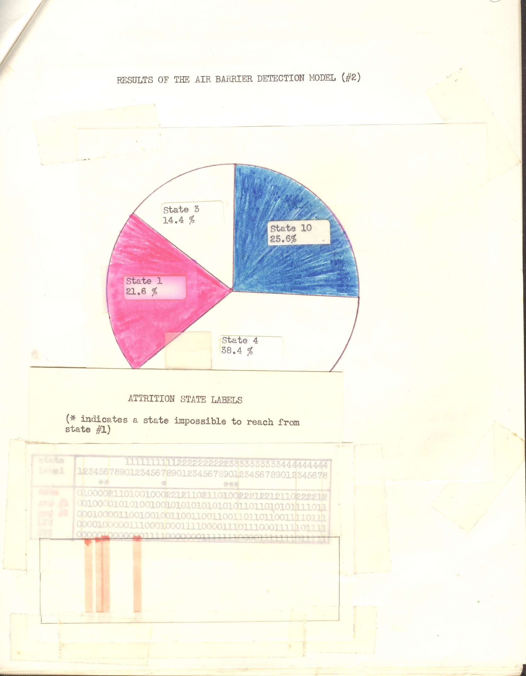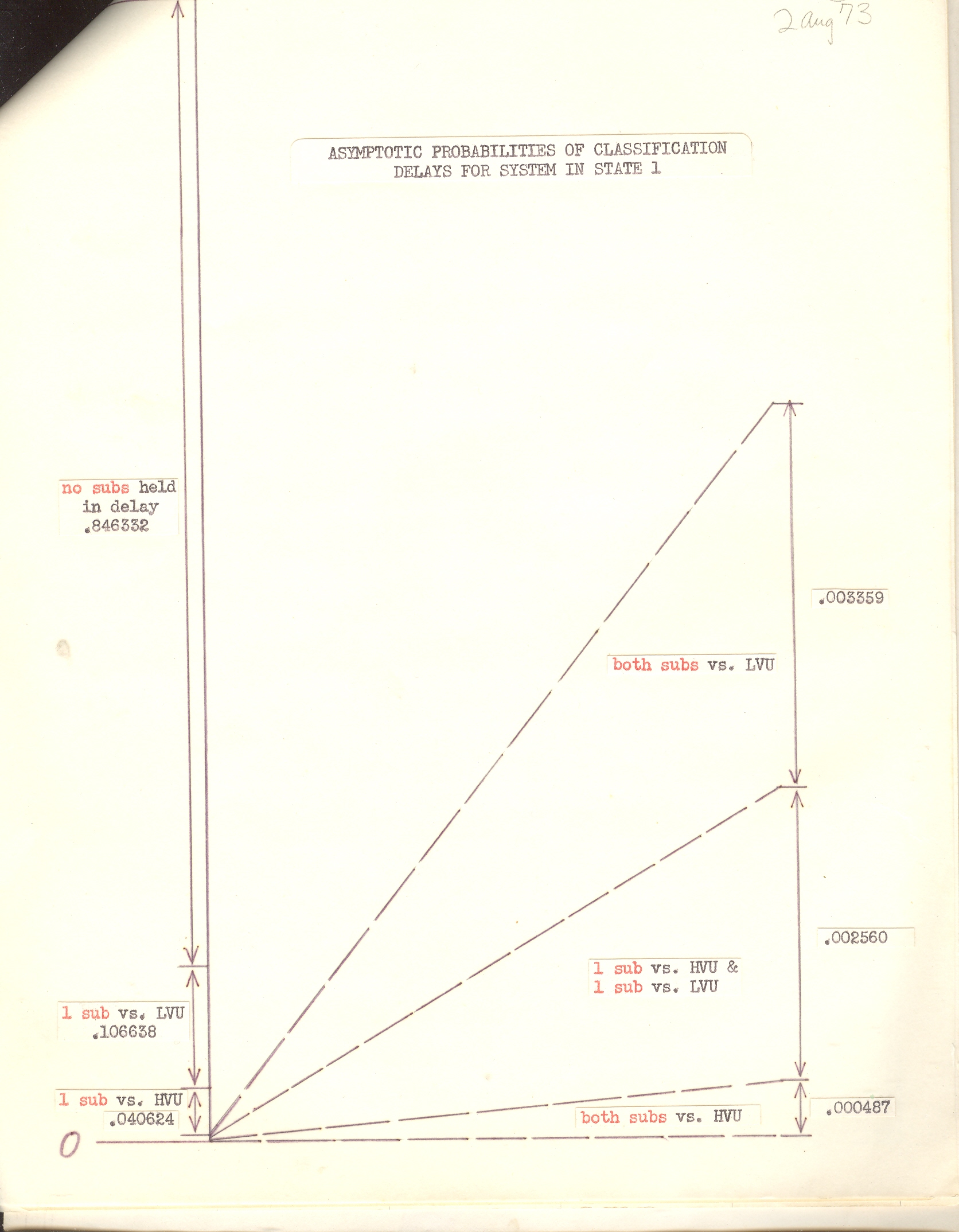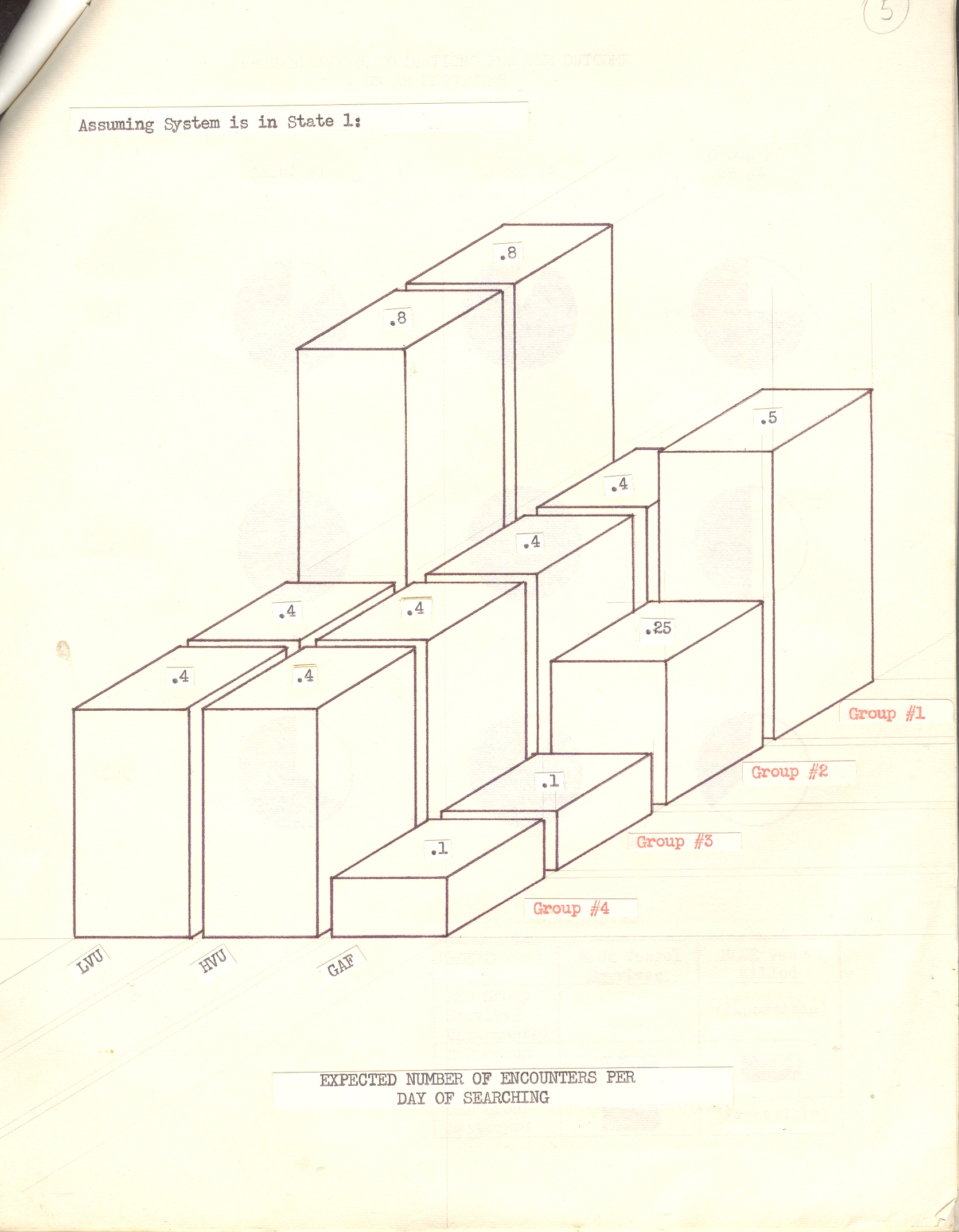 These original sheets were, it seems, prepared for an illustrated (1973) talk on a statistical model for the detection of anti-submarine warfare threats—unfortunately I’m at a loss to distinguish much of importance here, though I’m sure that someone who is the least bit familiar with defense modeling and simulation would instantly and easily interpret theserelatively simple images. I’m presenting them here because they are to me an example of excellent presentation, design and logic—a fine symbol for the presentation of graphical information in a pre-PowerPoint past.