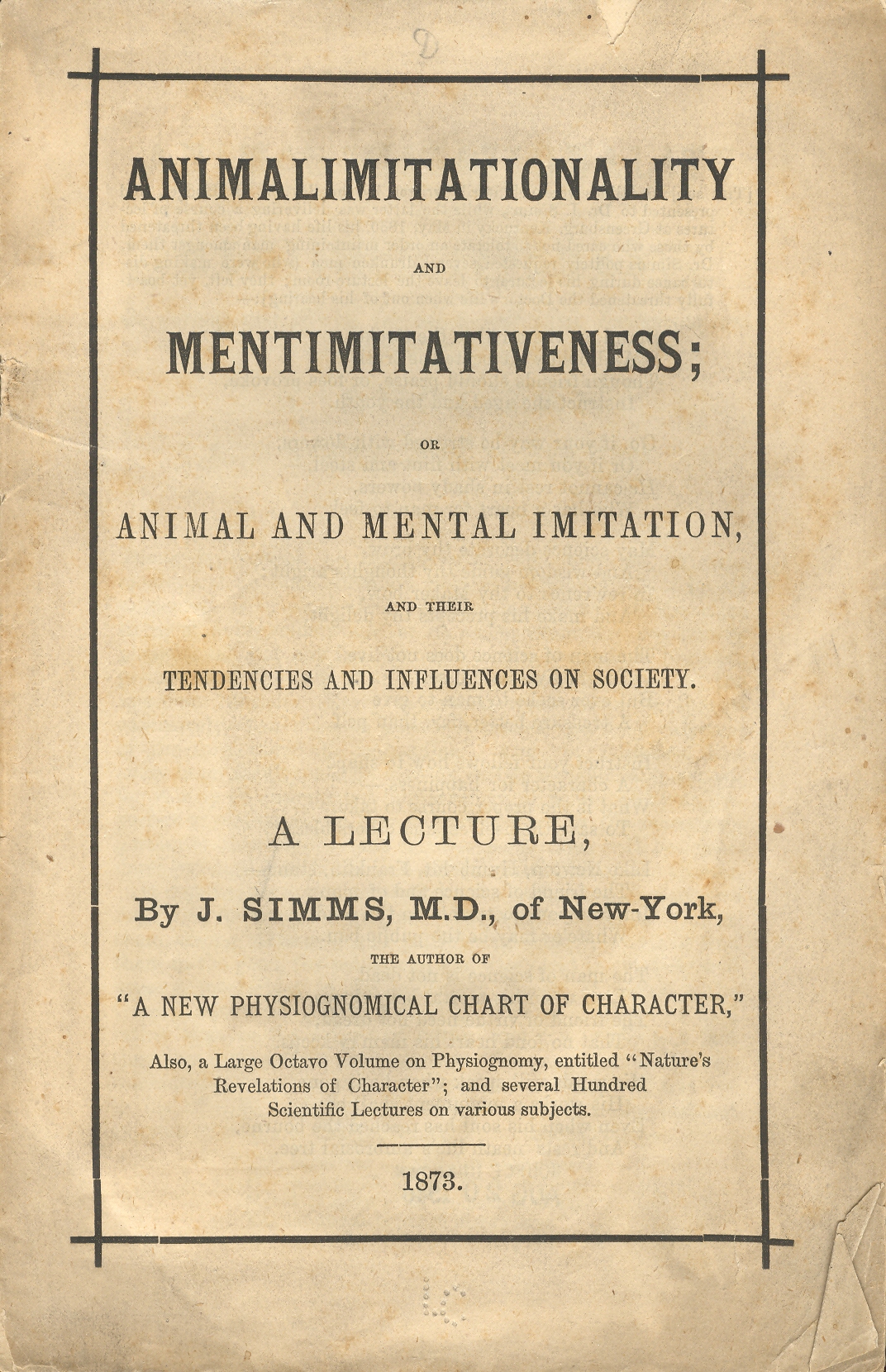 The fabulouslessness and learned foolishness of J. Simm's horribly-named Animalimitationality and Mentimitativeness; or Animal and Mental Imitation and their Tendencies and Influences on Society, a Lecture, seems a poor-man's ramble in a polysyllabic scribble. At it base, J. Simms (listed as "M.D"., and who was also the author of A New Physiognomical Chart of Character) presents a two-paragraph idea and published it over twelve pages that seem twelve pages too many. The idea is basically so: humans at time resemble animals because animals imitate what they see, as do humans. That is principally the entire deal, though it evidently was the cause of numerous lecture bookings for Mr. Simms. And what Mr. Simms talks about are the problems of imitation, the results of which are found in tight shoes, tight corsets, big hats, and bad walking, all leading to debauched society and wrecked personal dreams.