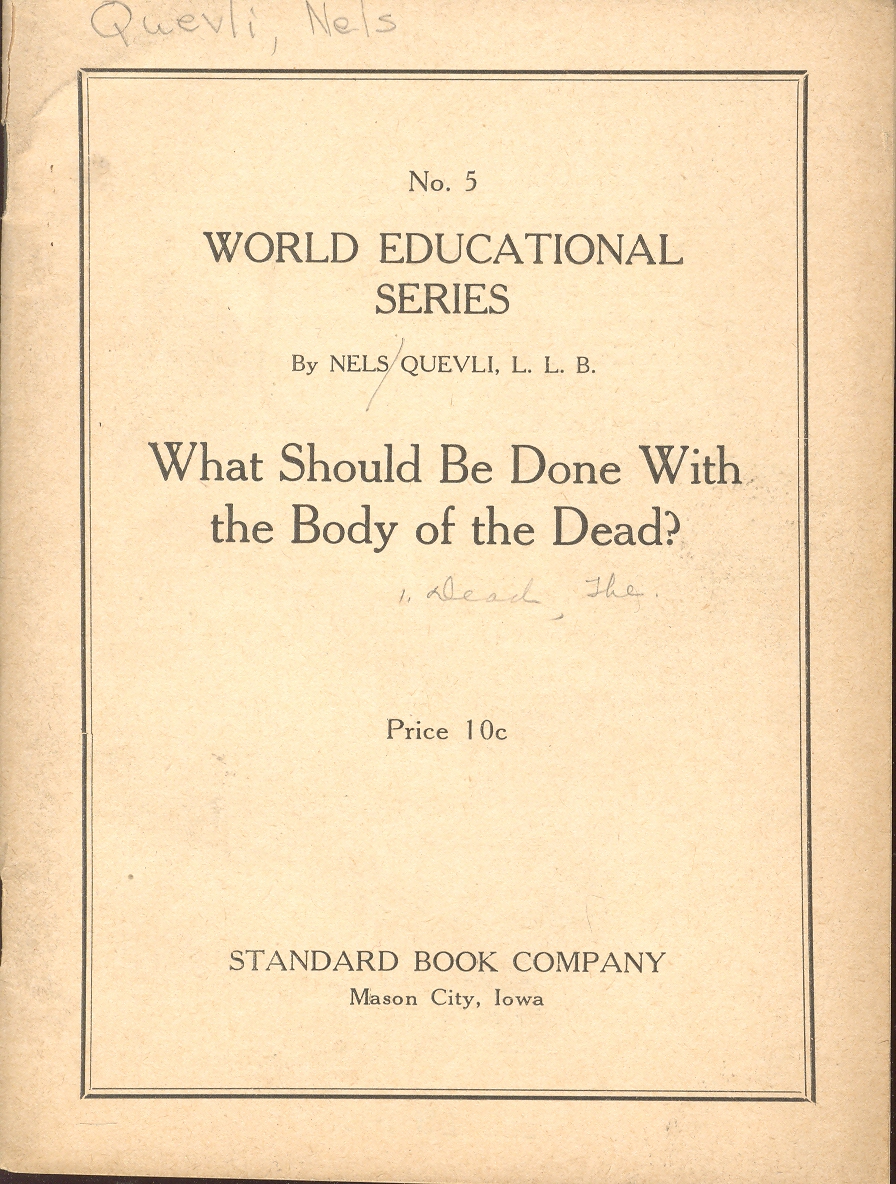 Nels Quevli, the Mason City, Iowa author of the oddly-titled What Should be Done with the Bodies of the Dead (1936), does indeed have a point that rises above his oddly-titled, laugh-imminent pamphlet.. It is a little laborious getting there, and the 71-year old ex-pharmacist and “science writer” with “fifty years” of studying death really could’ve used a little editing in his 47-page exegesis, but a five-minute scan gets you past the grueling set-up to what the man is really worried about: being buried alive.