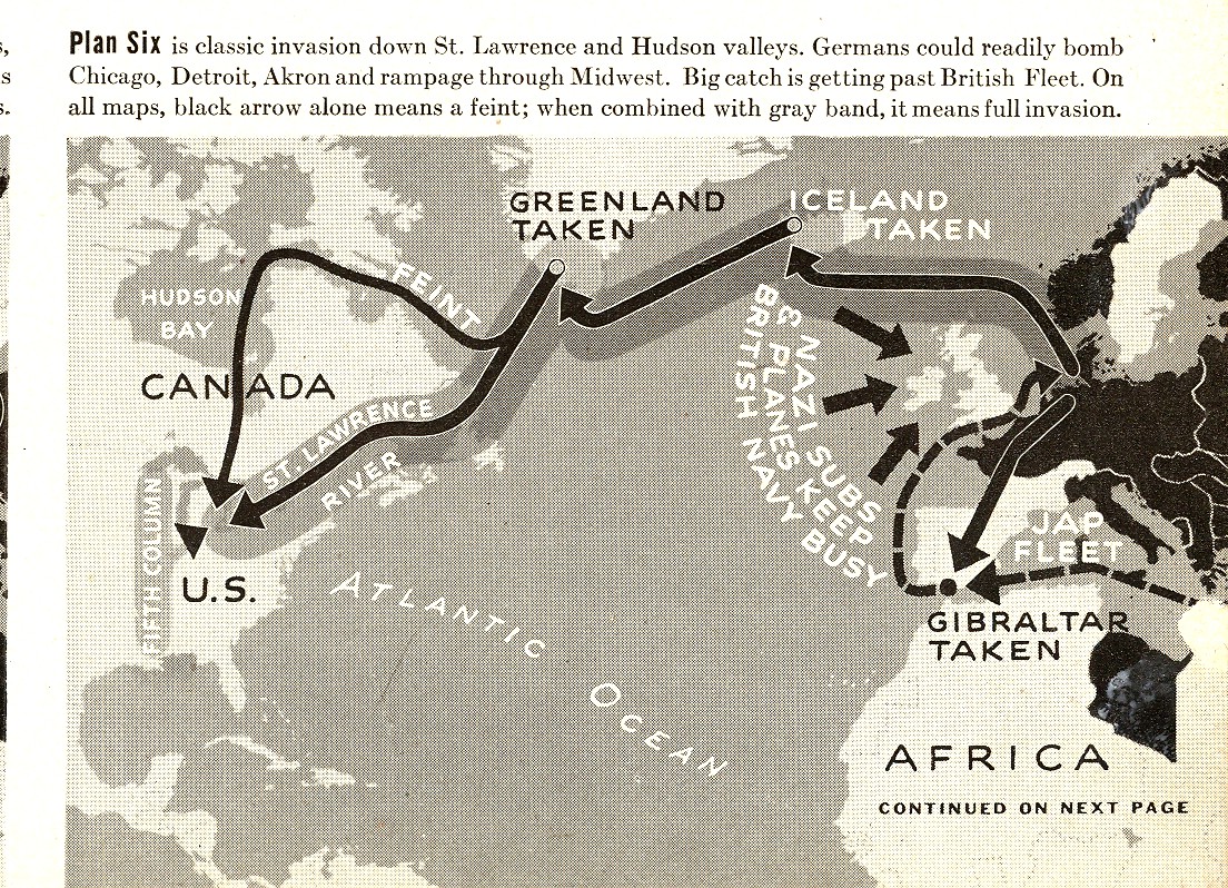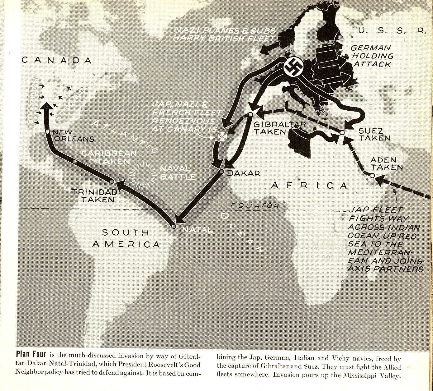 The following maps appeared in a two-page spread, detailing ways in which the Axis powers could combine their efforts, focus on America, and take over the country. Maps such as these with arrows being drawn towards America were absolutely uncommon during this time.