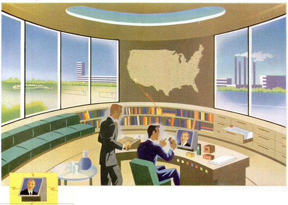 In another weirdly prescient image--"weird" anyway for a quick effort made by an artist trying to sell drunk juice--is this proto-internet office view, made in May 1945. There's lots of passive solar going on here(though not really very effective when you consider the other ways of directing and filtering exterior light inside) in the office of tomorrow, but more important is the desk and the file cabinets. The seated man is talking to someone across the country via phone/wireless, with data en masse at his fingertips, a "computer" (in the old sense of the word, that being a person--and usually a women--given the charge of adding long columns of number or whatever and then doing the arithmetic, like a comptometer) working some sort of calculating interest on the largish calculating instrument. In general we see a decision-maker awash in responsibility connecting all of the parts of his world: a primitive, secular, analog internet. And this too just at about the same time that Vannevar Bush introduced his own vision of the informational future with his superb Memex (which I wrote about earlier on this blog here.)