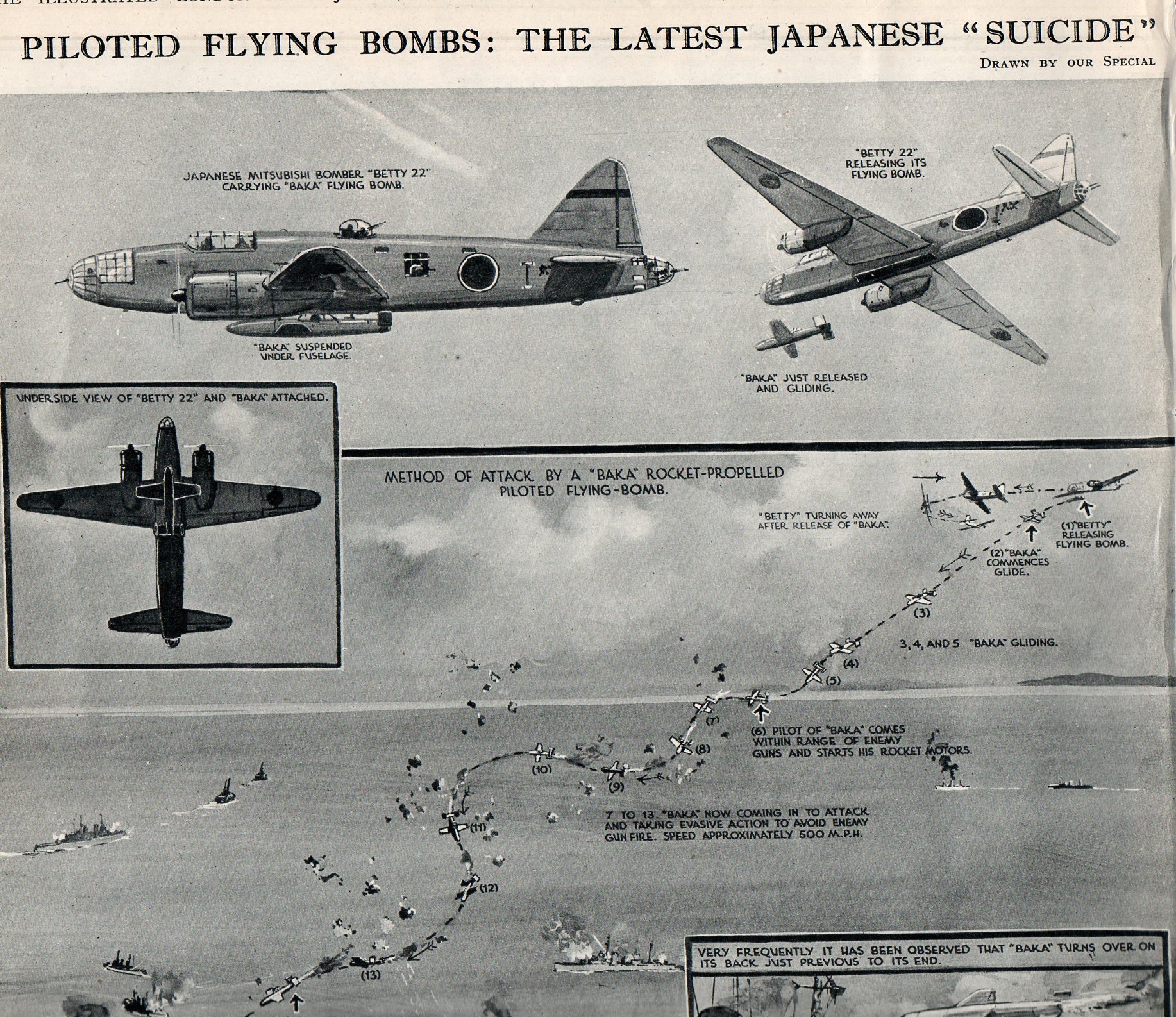most feared weapons–the jet-powered human bomb of the Japanese naval air force. (In practice though the weapon didn’t produce that must damage though it did produce the fear: “the operational record includes three ships sunk or damaged beyond repair and three other ships with significant damage; seven US ships were damaged or sunk by Ohkas throughout the war”1). The Yokosuka MXY-7 Ohka was a purposefully designed and built rocket powered suicide rocket whose sole purpose was to attack and destroy ships. They were first produced in 1944 as unpowered glider aircraft, and then later in November 1944 the rocket propulsion system was added. All tolled, the Yokosuka and the Kasumigaura Naval Air Arsenal together built about 850 of them–fewer than 3 dozen survived.