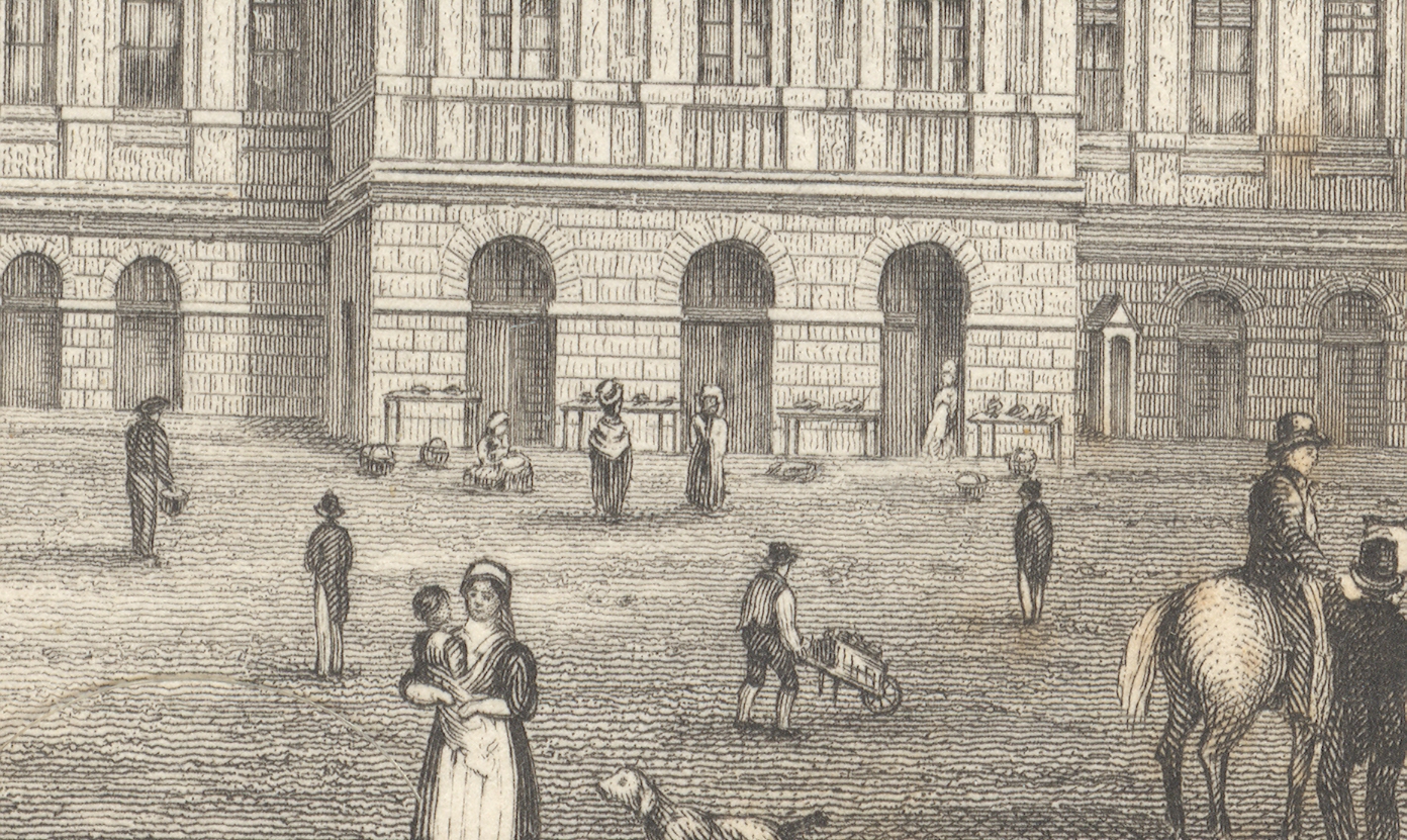 Extraordinarily, what the artist snuck into the original is a tiny (2mm) figure watching over several tables of her (fruits?/vegetables?) ware, waiting for a customer. There doesn't seem to be much interest in her stuff, currently, and she has allowed herself a little relaxation, leaning against the doorway. I've found this sort of extremely minor subject matter and its ephemeral connection to the larger work at hand to be just fascinating. I wonder why such detail would be added--why would the artist, or engraver, take such care and interest in such minor visions. Perhaps this is just what was at hand on the days the artist fleshed out his work; perhaps it was the work of the engraver, alone, incising yet another semi-boring architectural image; desperate for a little artistic activity, adding some interesting, almost-invisible touches, here and there. Perhaps no one would ever really notice them, but whoever was responsible for adding such incredible, extra-dimensional details would certainly enjoy knowing they were there, recognized or not.