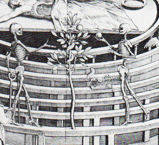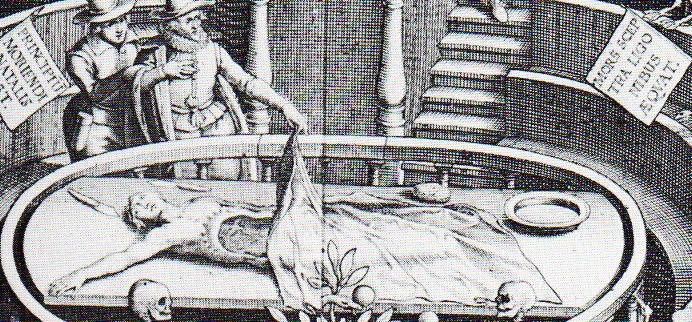 the painting by J.C. Woudanus) published in 1616 were recognized as pure iconographic ornament. They decorated the last layer of the dissecting laboratory/pit, an immortal reminder of mortality--perhaps aggressively so, since people were there to watch other people take apart humans and animals and such, which would seem to be a nice reminder of the Big Sleep that awaits all. But no matter, they wer there, Eve with apple, Adam with spade (?), the tree with the forbidden fruit flourishing still around all of the bones, the snake surviving as well.