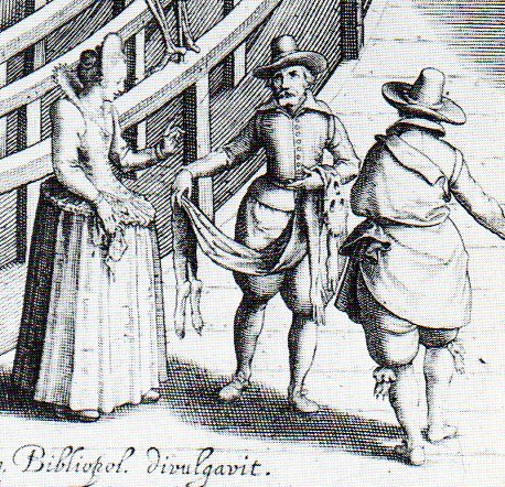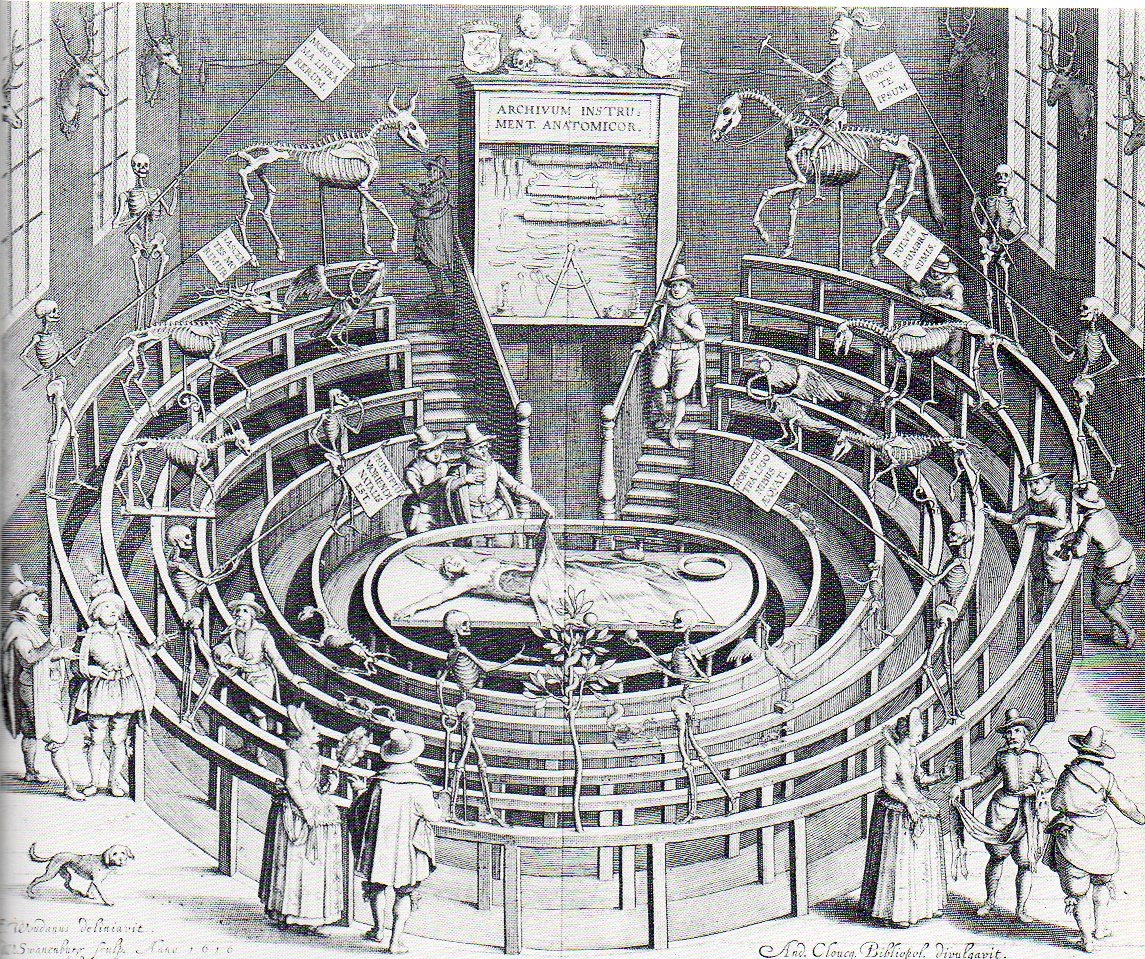 Visitors to the dissecting amphitheatre here in Leiden were treated to a bone museum during the days in which the place was not being used for its main purpose, though we do see here that a cadaver is being semi-privately displayed, a burgher taking a reticent look (cloth held between thumb and index finger?) while the compatriot takes cover behind him.