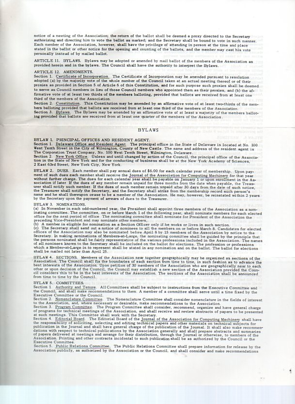 Looking at this document from the beginning of the first tweeks of mass professionalism in the development of the computer emphasizes this business of time. This draft of the constitution and bylaws of the Association for Computing Machinery (the ACM) was complete in four pages, including the establishment of its members, officers, executive committee, meetings, bylaws, meetings--the whole deal, in four pages.