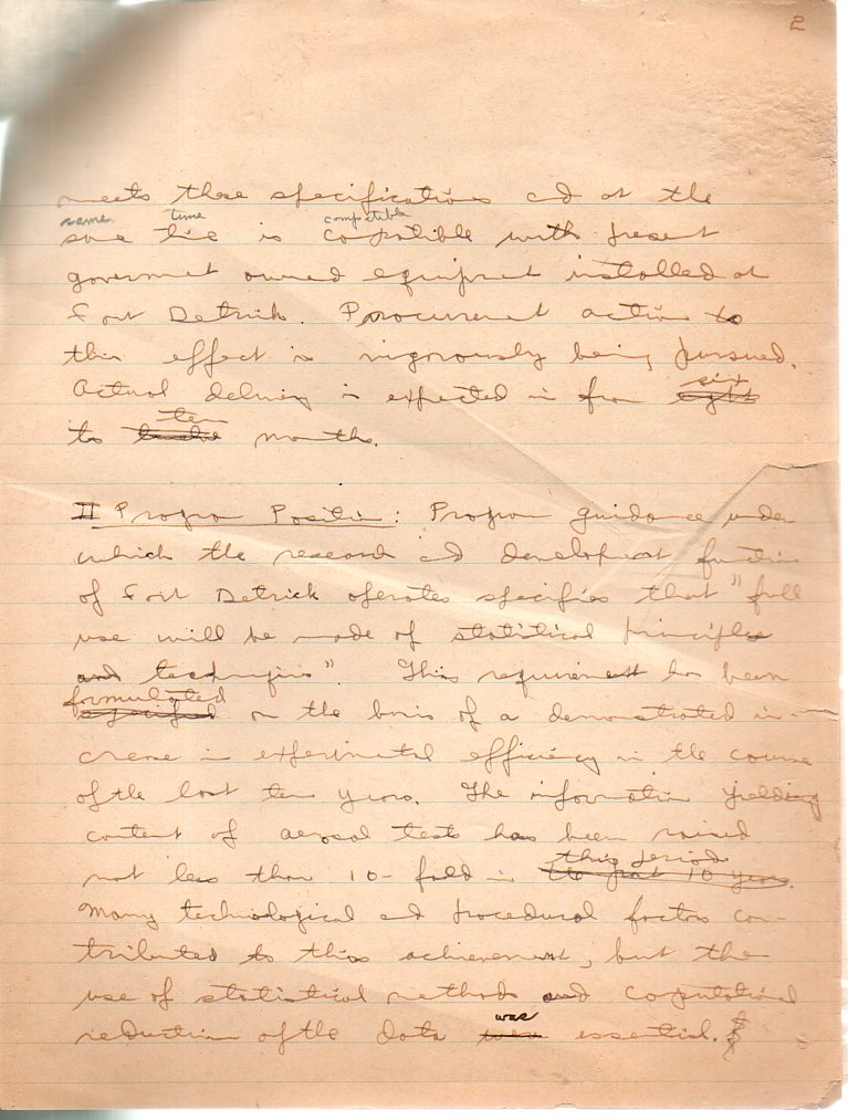 I've found an unusual, informal document; a rough, manuscript outline for a consideration on the computing capacities at Fort Detrick, in Frederick Maryland. Fort Detrick is a Medical Command, and was the seat of research for the United States' biological weapons program (1943–69), and which is today a large facility (on 1,200 acres) devoted to biomedical research, the "U.S. Army Medical Research and Materiel Command (USAMRMC), with its bio-defense agency, the U.S. Army Medical Research Institute of Infectious Diseases (USAMRIID)", as well as medical materiel management and global medical communications.