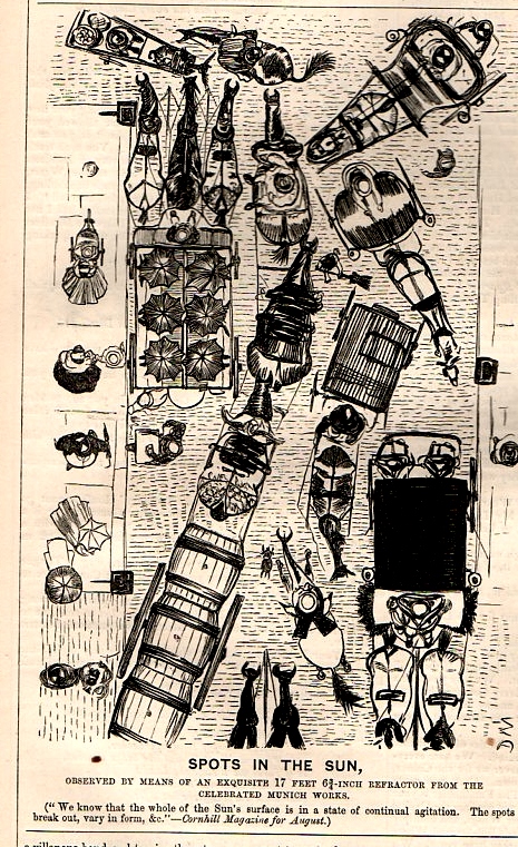 At first I wasn't sure that "sunspots" were chosen for this cartoon for any particular part of their history in 1868--that is, if 1868 wasn't a particularly big year for sunspots. In general they were certainly known by this point for more than a thousand years, though the greatest recent attention with optical instruments occurred with Thomas Harriot, Johannes & David Fabricus and Christoph Scheiner all around 1610-1612, and then most famously with Galileo who recorded them in 1612 in his Istoria e Dimostrazioni Intorno Alle Macchie Solari e Loro Accidenti Rome (or History and Demonstrations Concerning Sunspots and their Properties, published 1613). And closer to this time (among other things) Heinrich Scwabe had published (in 1843) a major advance on the cycle of sunspots. But as it turns out, though, the word "sunspot" had just entered the language in 1868, according to the Oxford English Dictionary, coming via Sir Norman Lockyer's Elementary Astronomy (1868), arriving as "sun-spot". High delightful! Punch was really quite on its toes on this one, employing a brand new word for a well-established astronomical phenomena to a rare view of looking straight down at a bustling street, cycles and all. (Another sort of cycle would soon come to be applied in the next few years in the pages of Nature to sunspots from the brilliant logician (and other things) William Stanley Jevons--this bit of thinking done in trying to correlate sunspots and economic depressions. This one wouldn't hold, though it was a very interesting idea.)