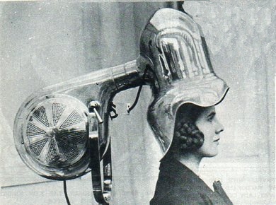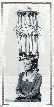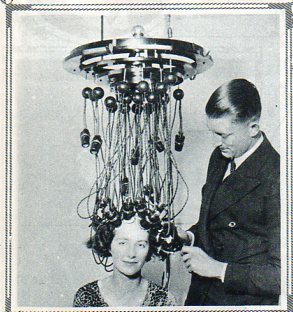 These images come to us from our not-so-dim Seussian/Medusian hair-care past, even though they seem to be instruments for hard-line delivery of intelligence. The hairdresser's tools were simple: pore openers, hair straighteners, hair curlers, heat setting heat setters, and the like. [The source is actually The Illustrated London News, 20 October 1928, page 720.]