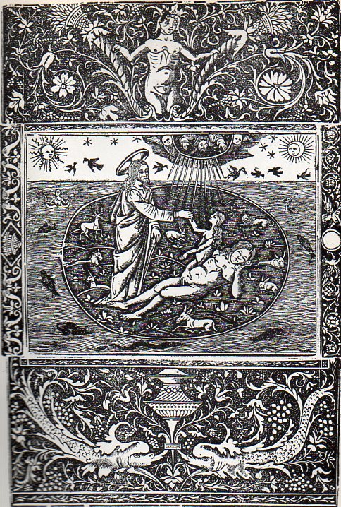 It is interesting that this image is a suggestion of the anatomical event, because Adam is shown whole and unmolested--I've seen many versions of this image showing Eve actually emerging from an opening in Adam's side, but the artist here is content enough with the suggestion of the bio-event.